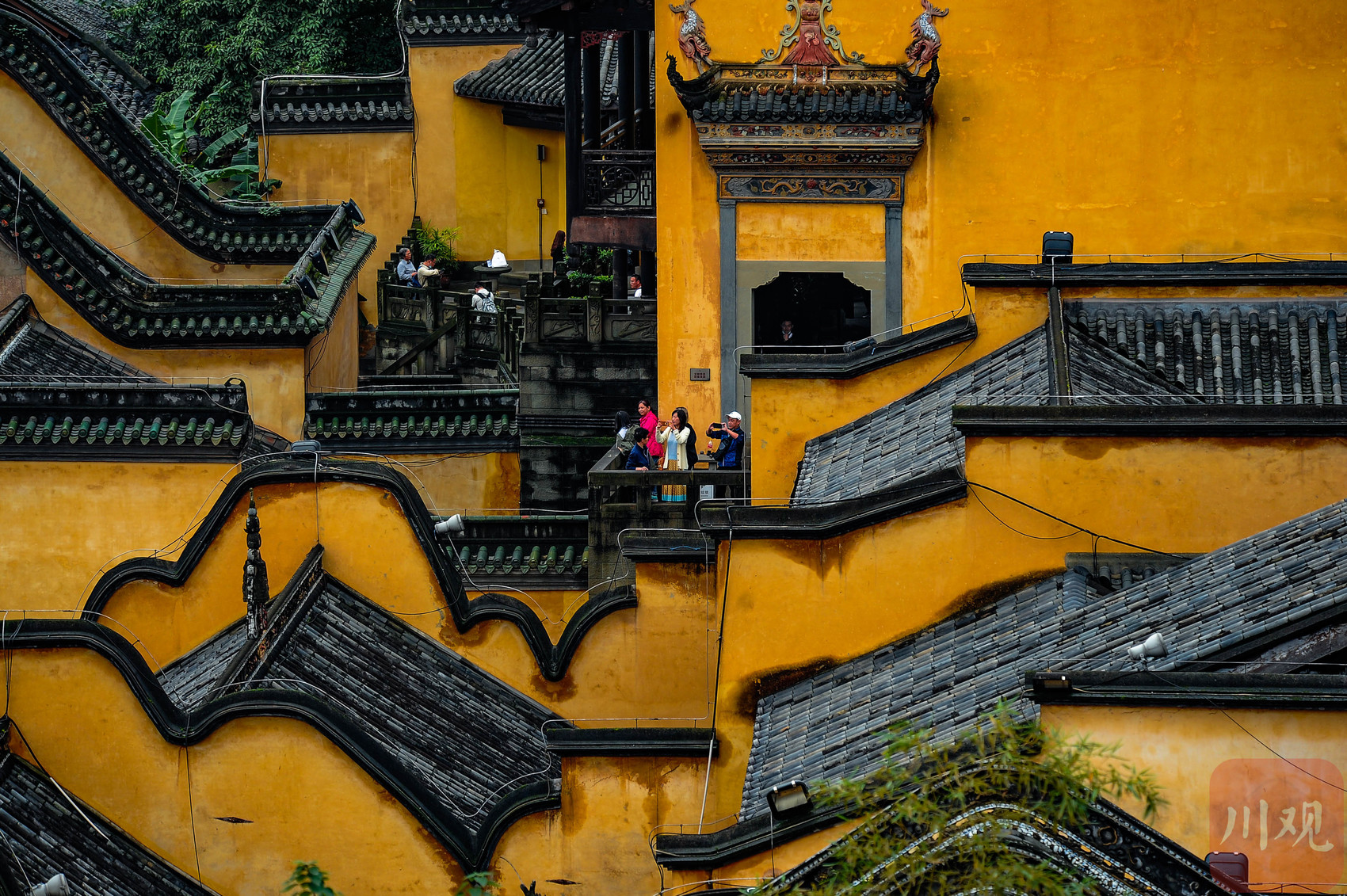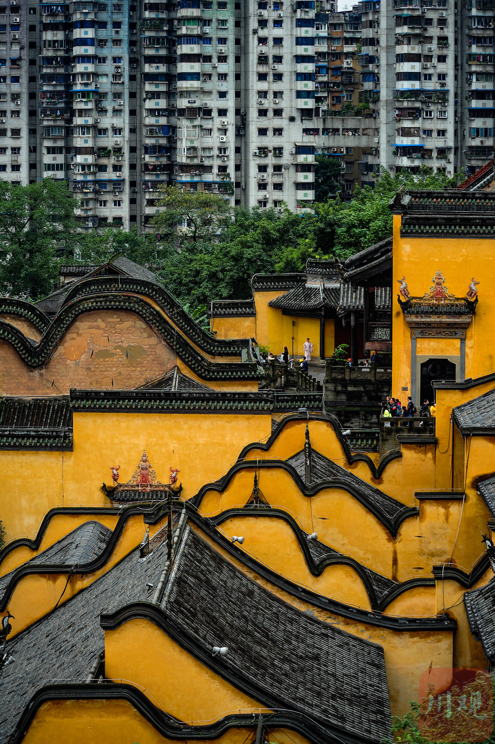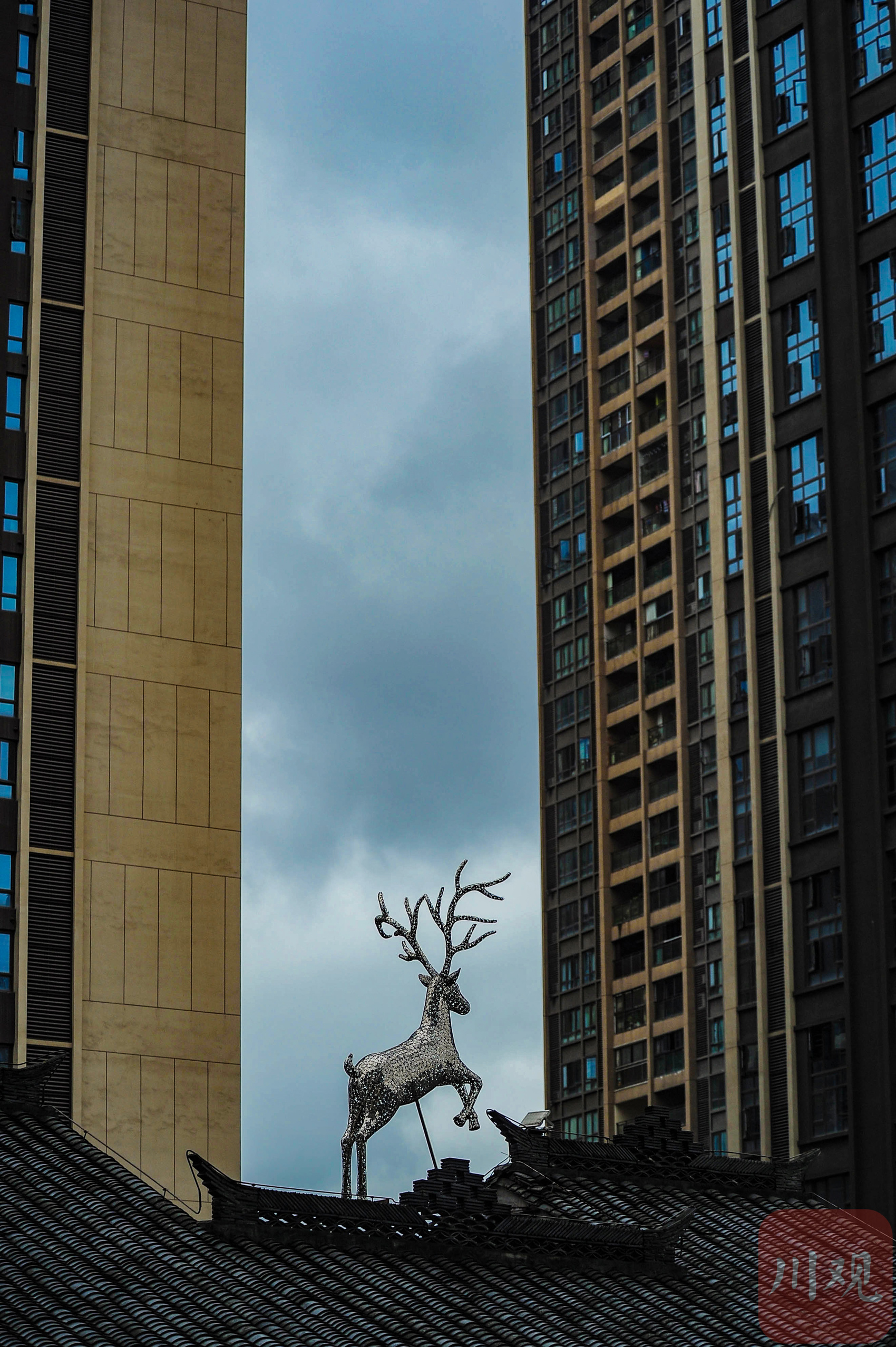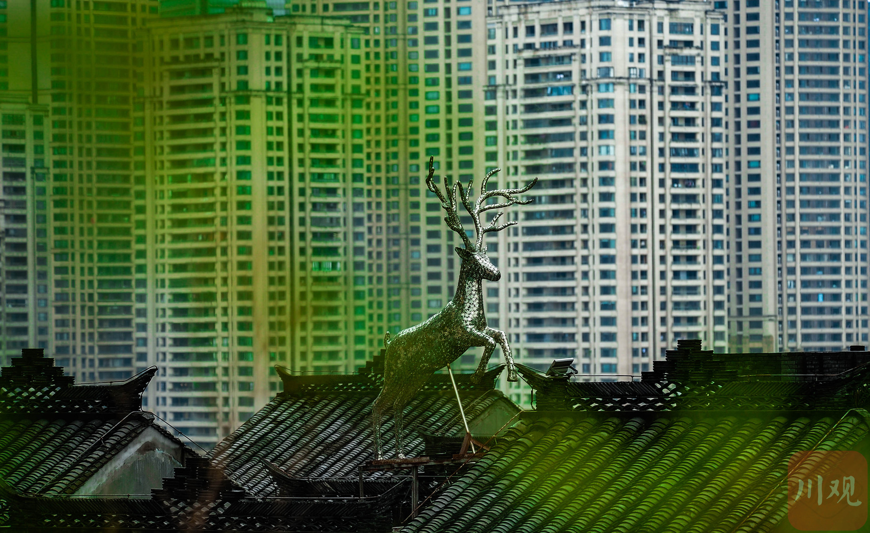 重庆南岸弹子石老街,传统中式屋顶上的灵鹿雕塑与背景的现代高层楼宇相映成趣。