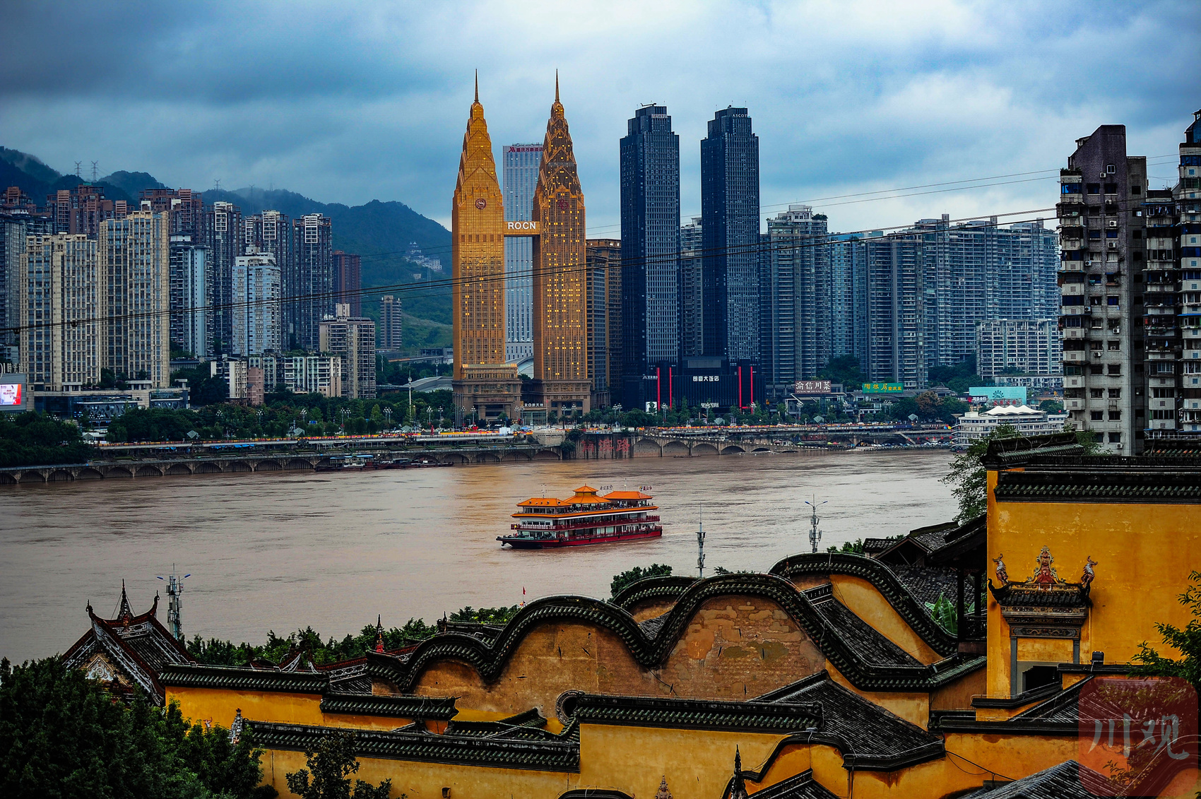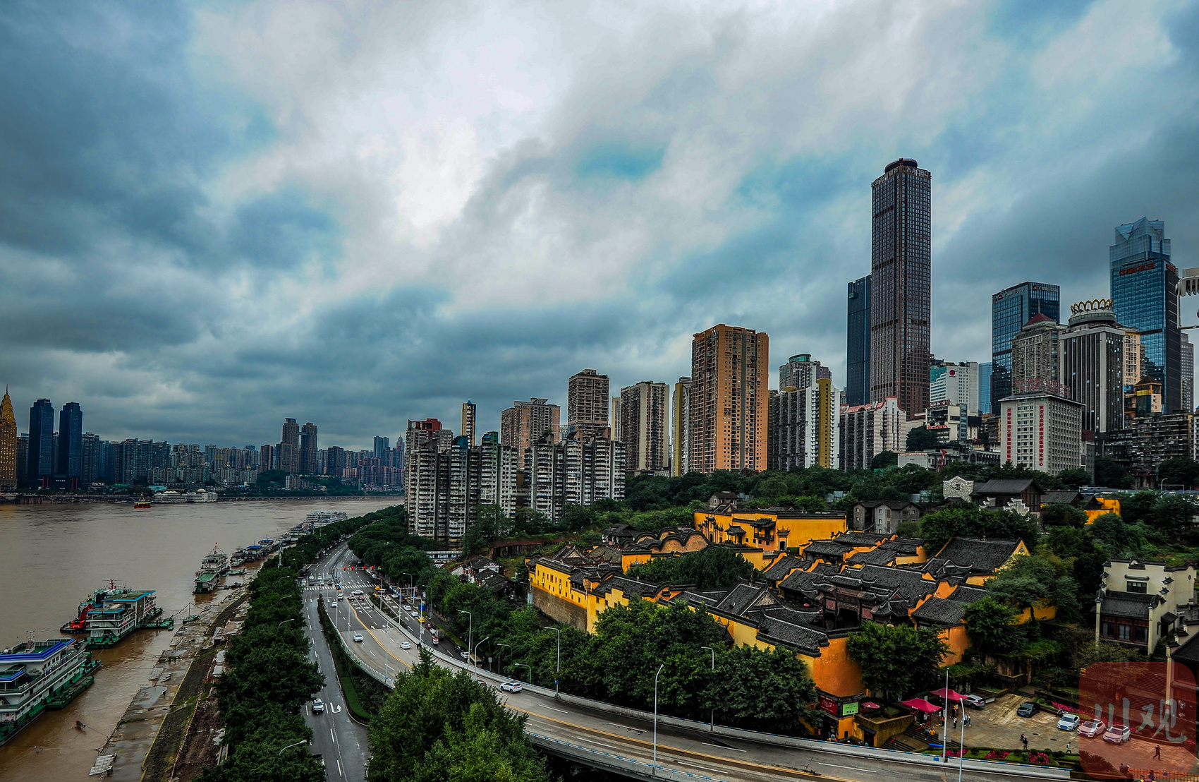 重庆渝中区湖广会馆建筑群前,长江江面有观光游船航行,对岸为南岸区南滨路建筑群。