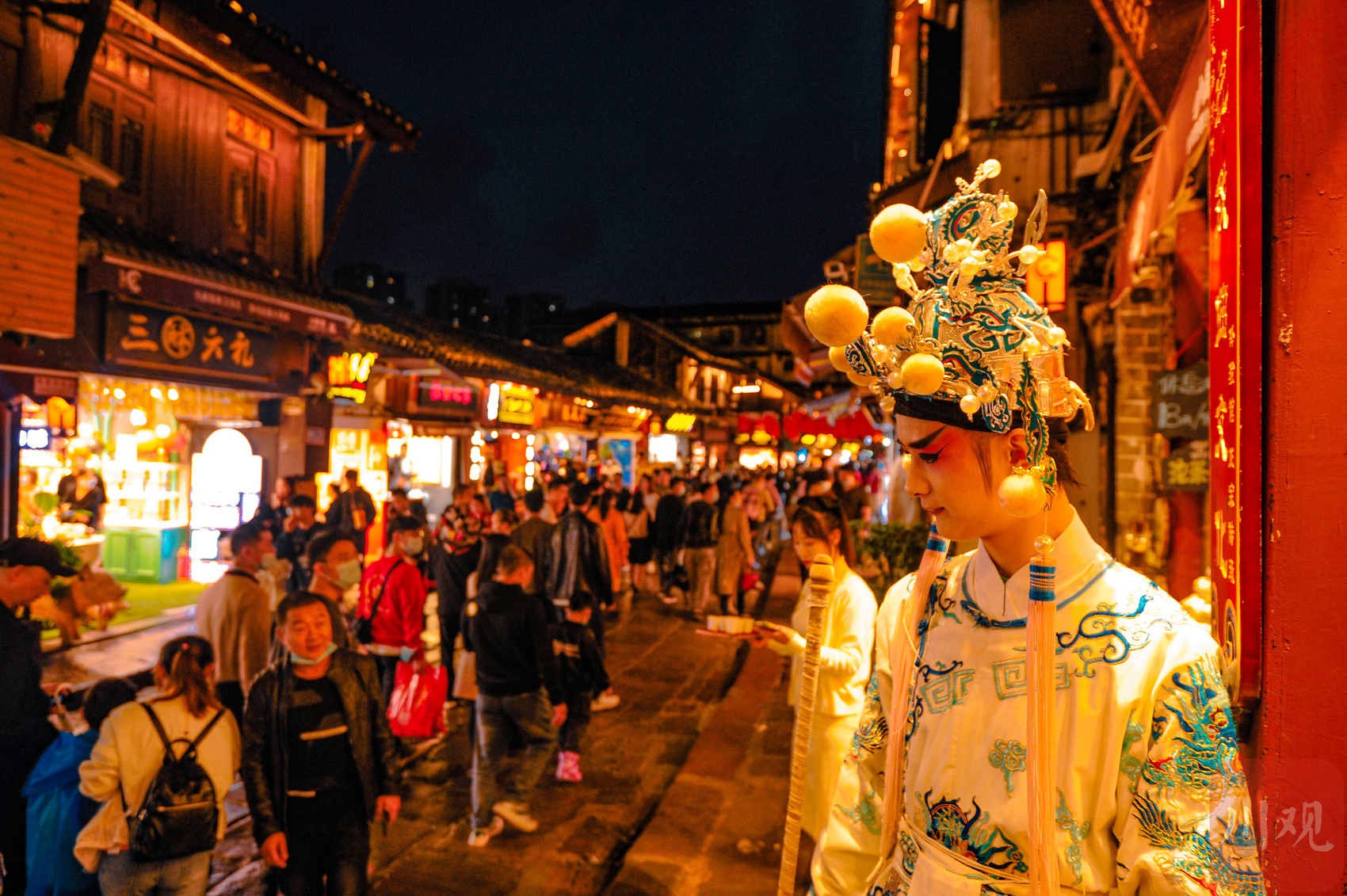 重庆磁器口古镇的夜景街巷中,一名身着传统戏曲服饰的表演者正在街道旁展示。
