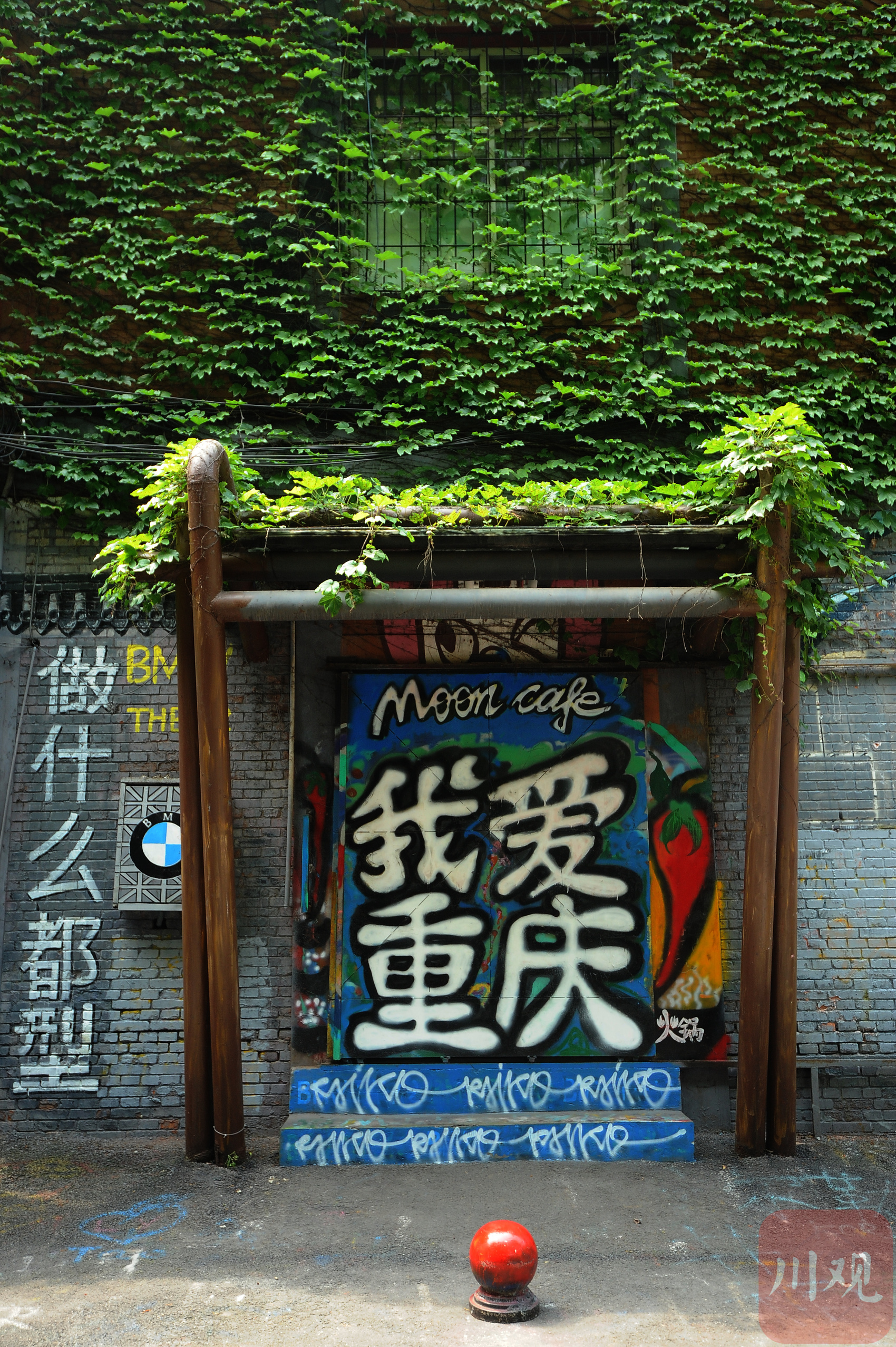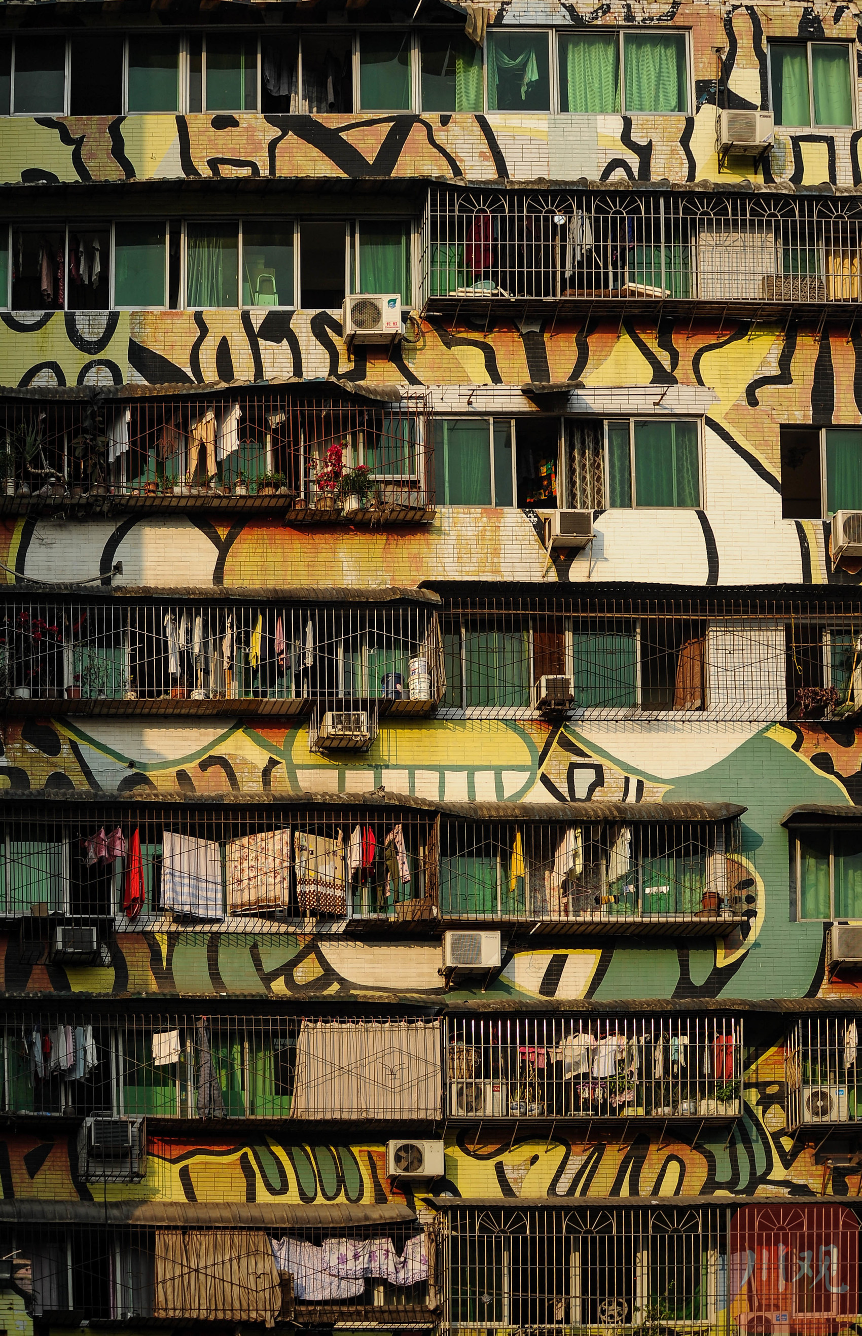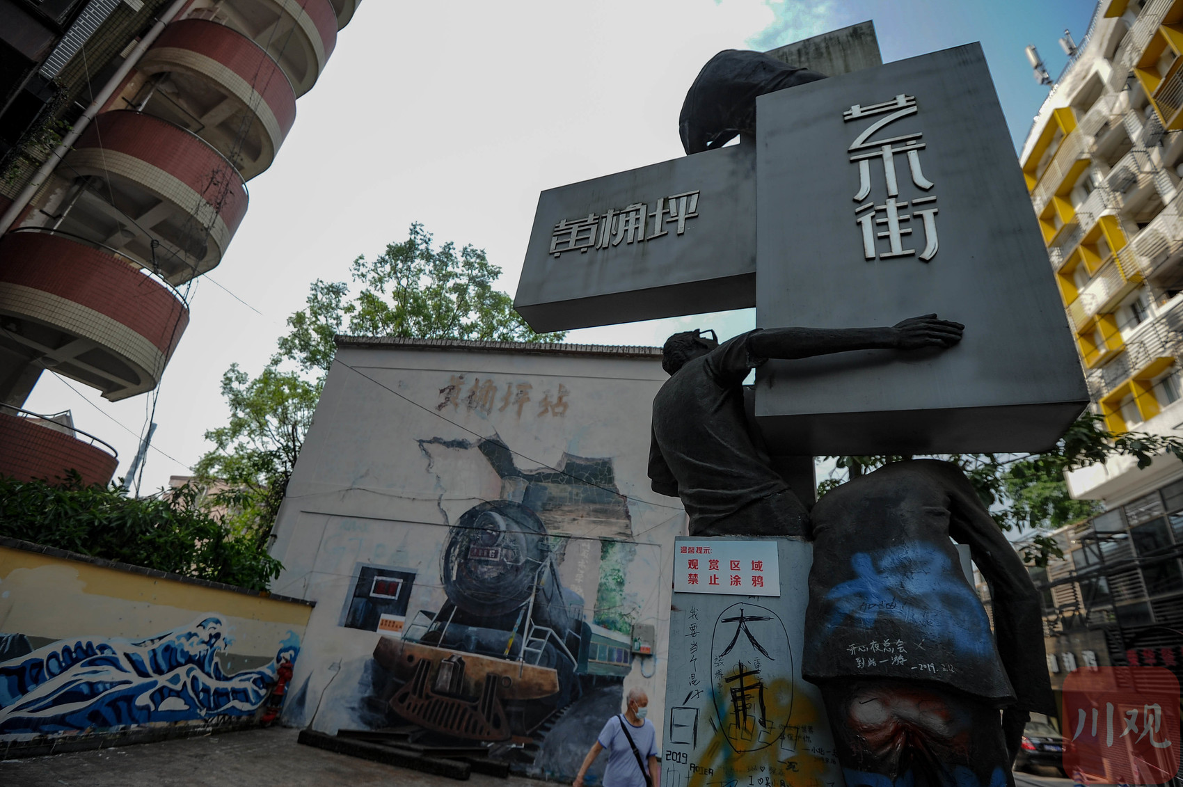 重庆黄桷坪街,居民楼外墙涂鸦与市井生活相映成趣。
