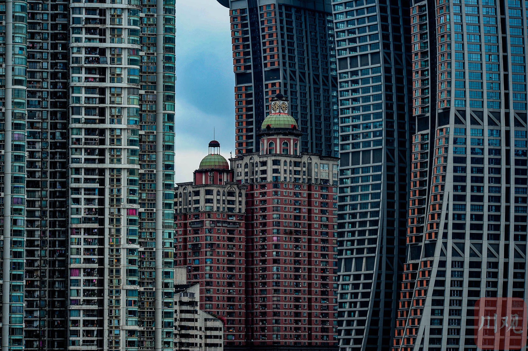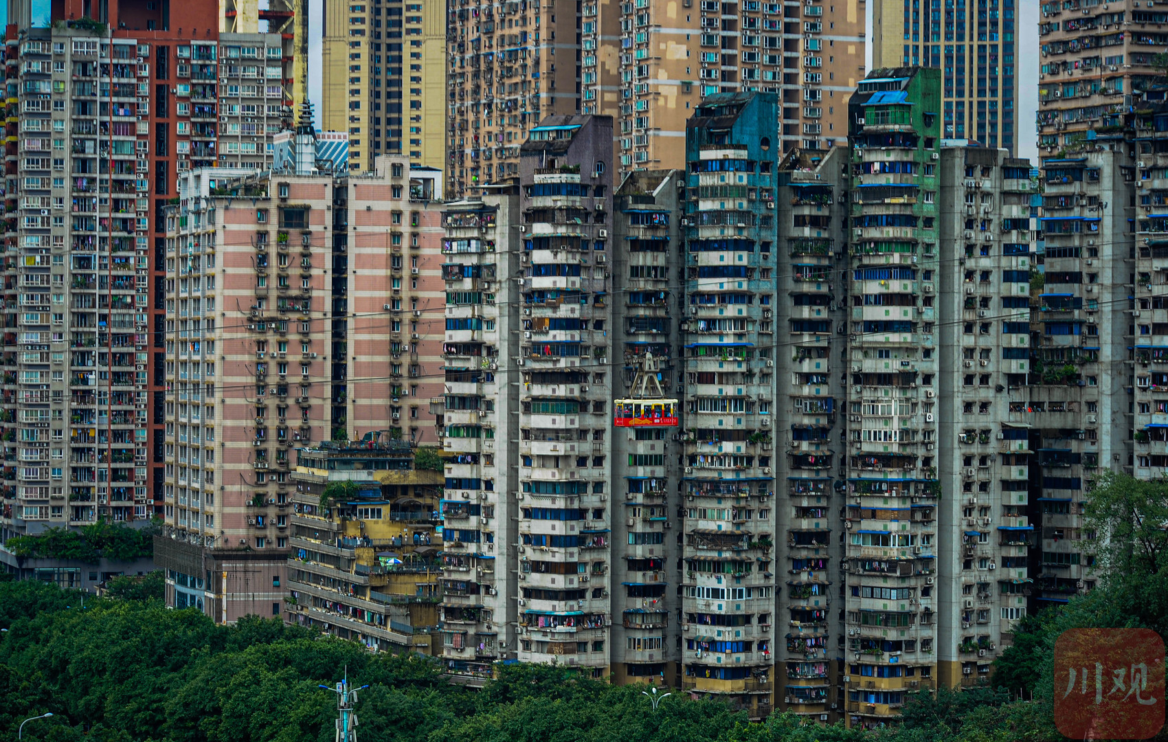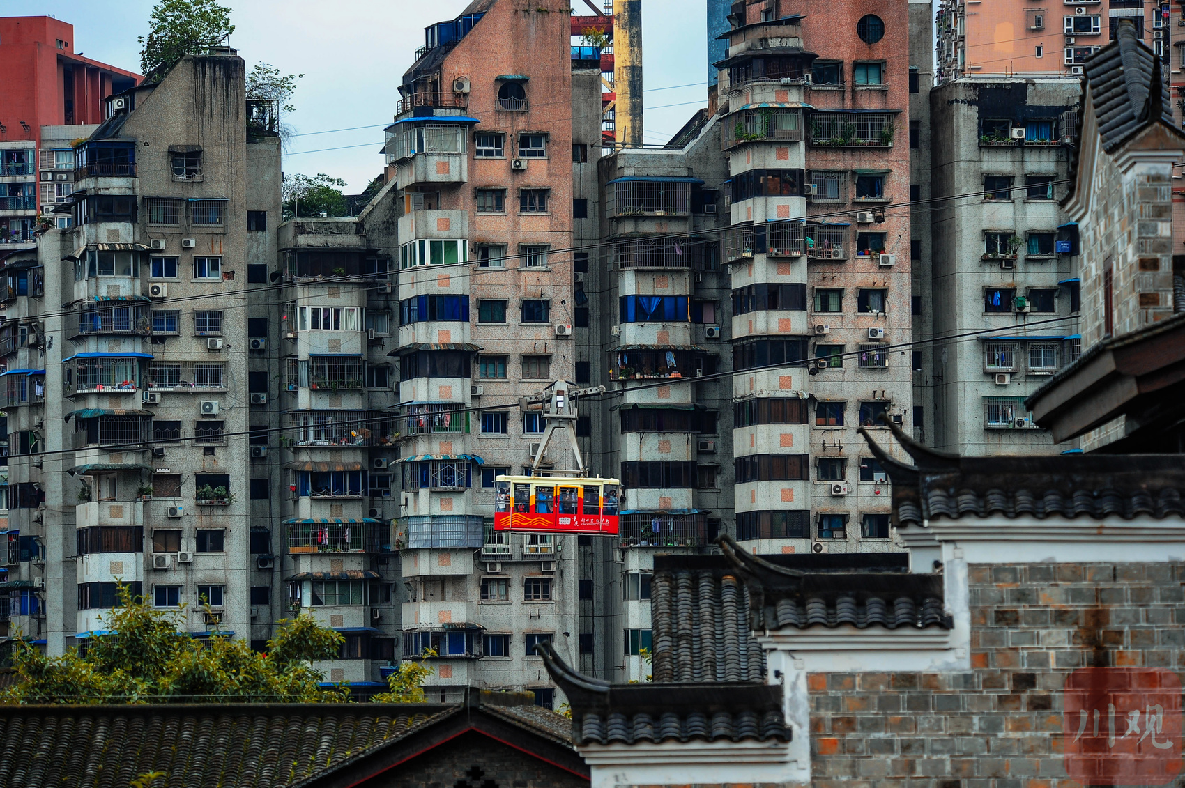 重庆渝中区白象居附近,长江索道轿厢穿行于高层居民楼间。