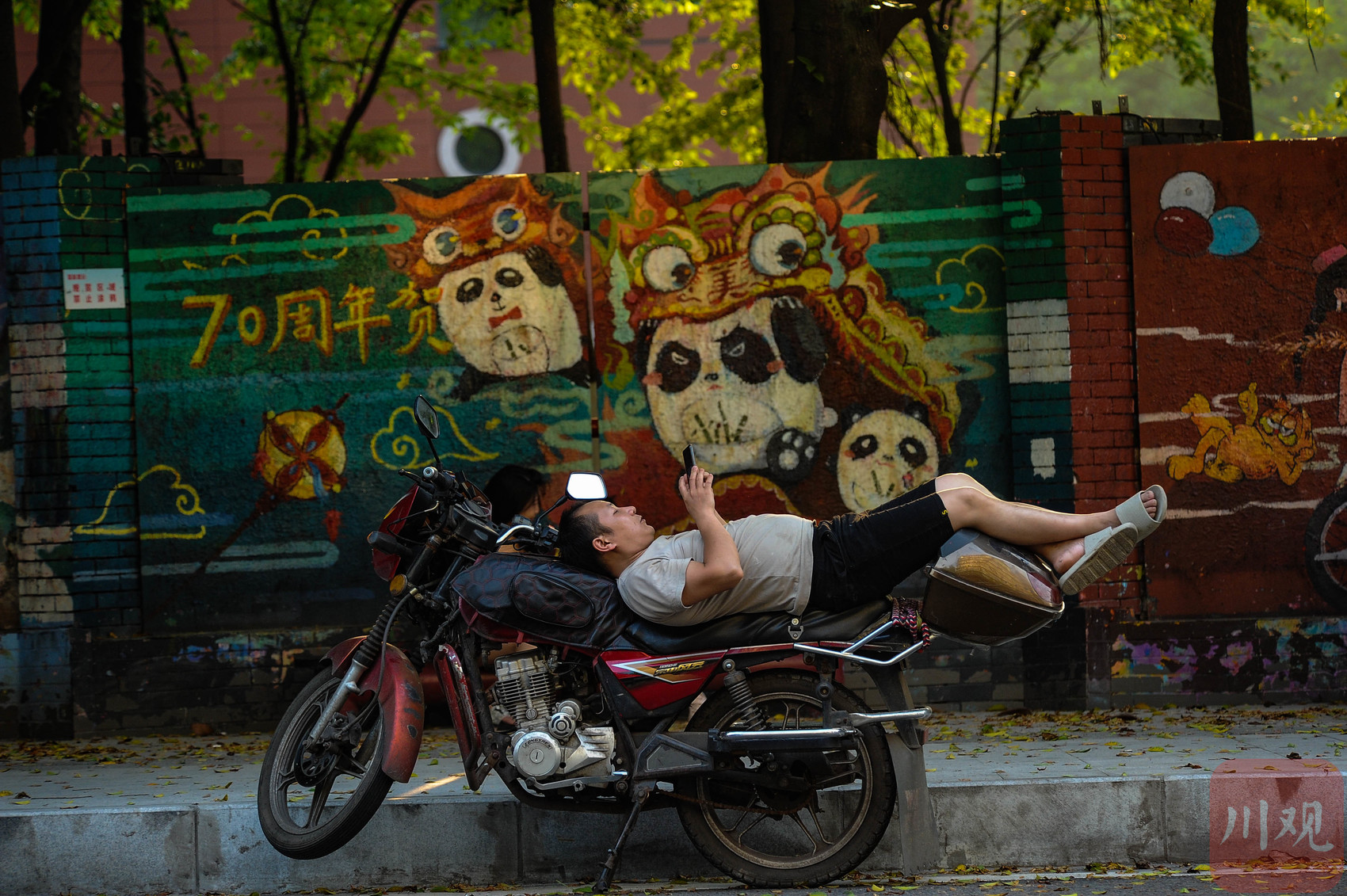 重庆黄桷坪,一位男子斜躺在摩托车上玩手机,与身后熊猫涂鸦墙相映,尽显市井松弛感。