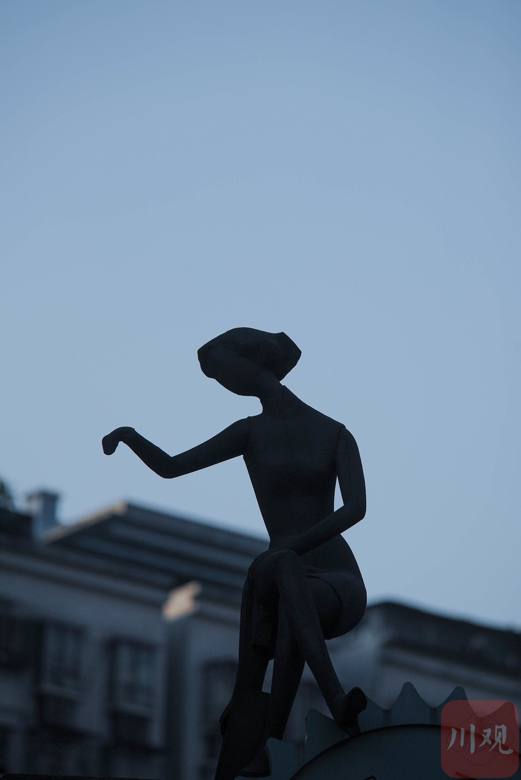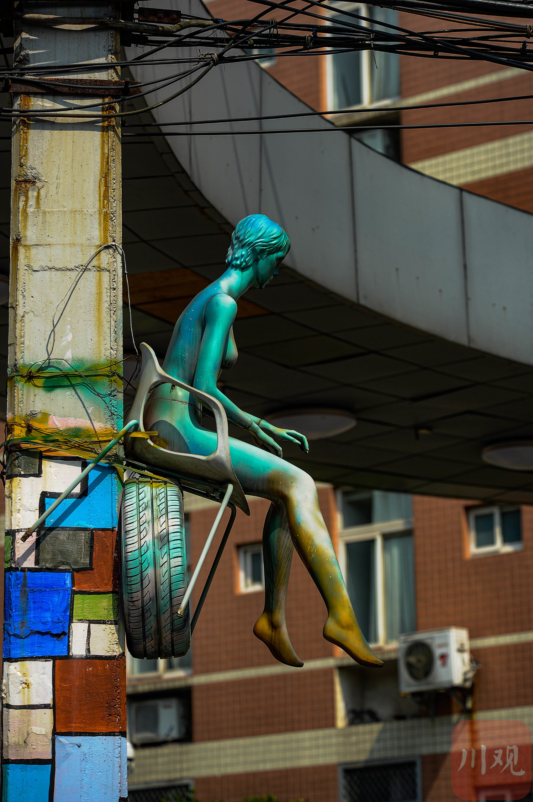 重庆黄桷坪,蓝绿色女性坐像雕塑,在工业背景中透着艺术张力。
