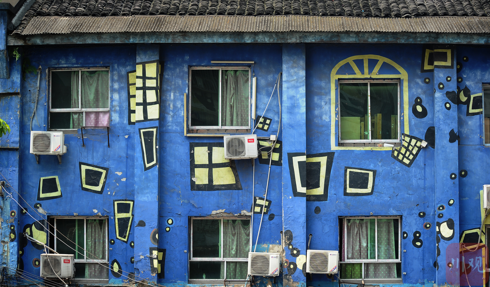 重庆黄桷坪,蓝色涂鸦老楼的几何色块与空调外机相映,尽显艺术街区的市井美学。