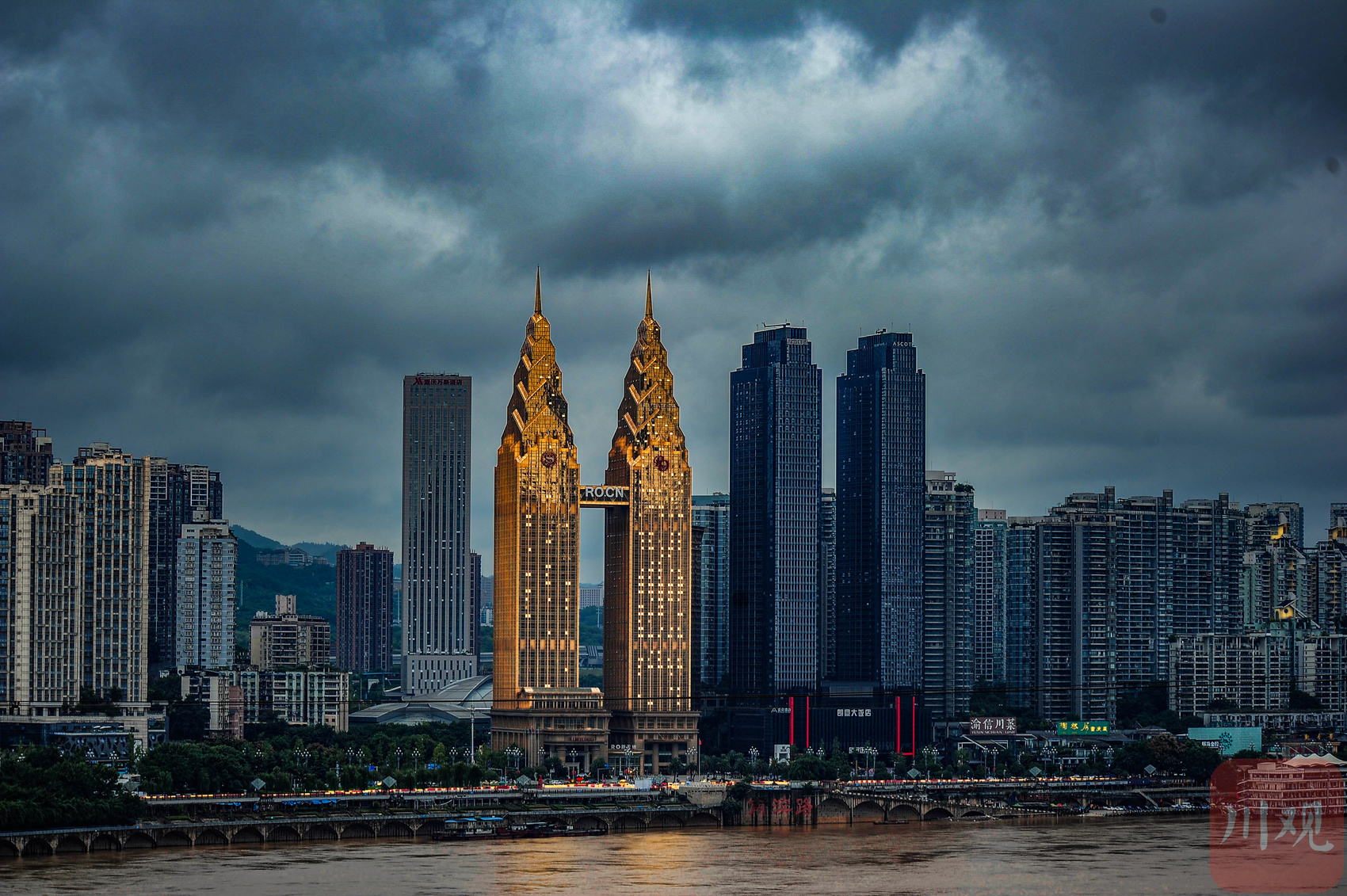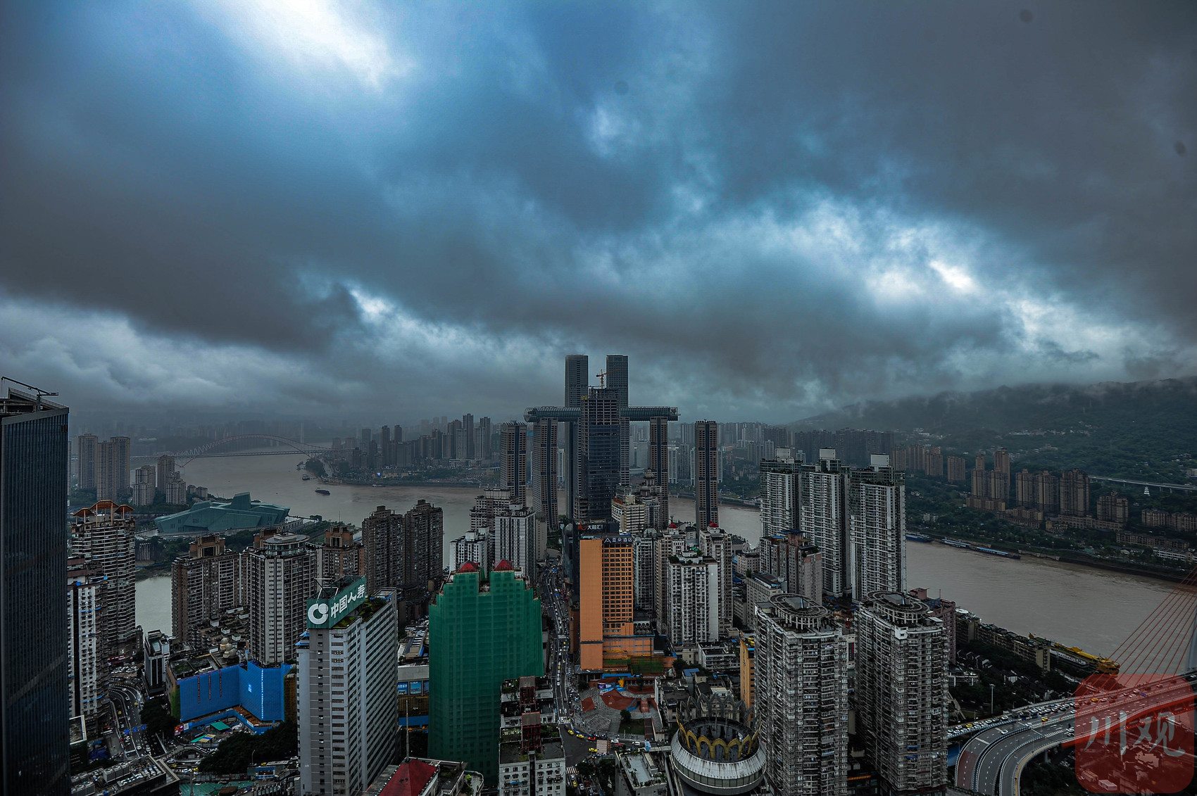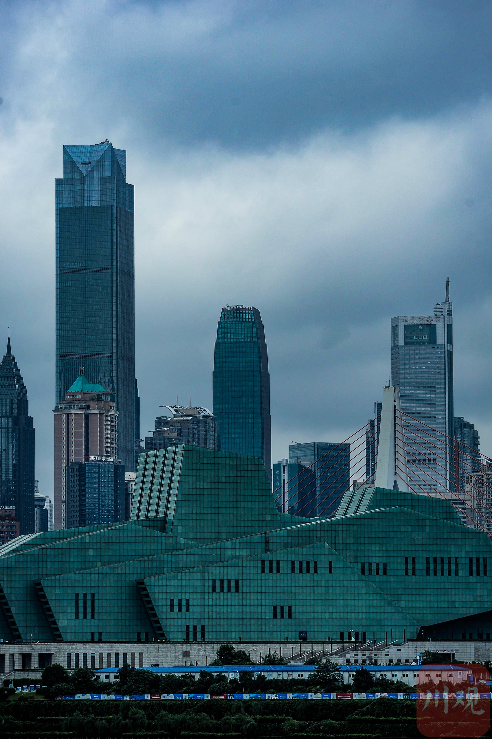重庆大剧院建筑外观与周边城市天际线。