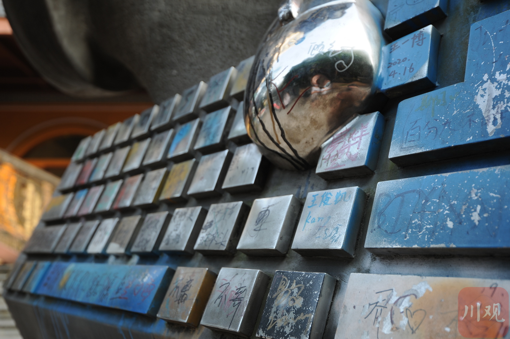 重庆黄桷坪街,巨型键盘雕塑上布满游客涂鸦留言,成为承载青春与热爱的街头记忆载体。