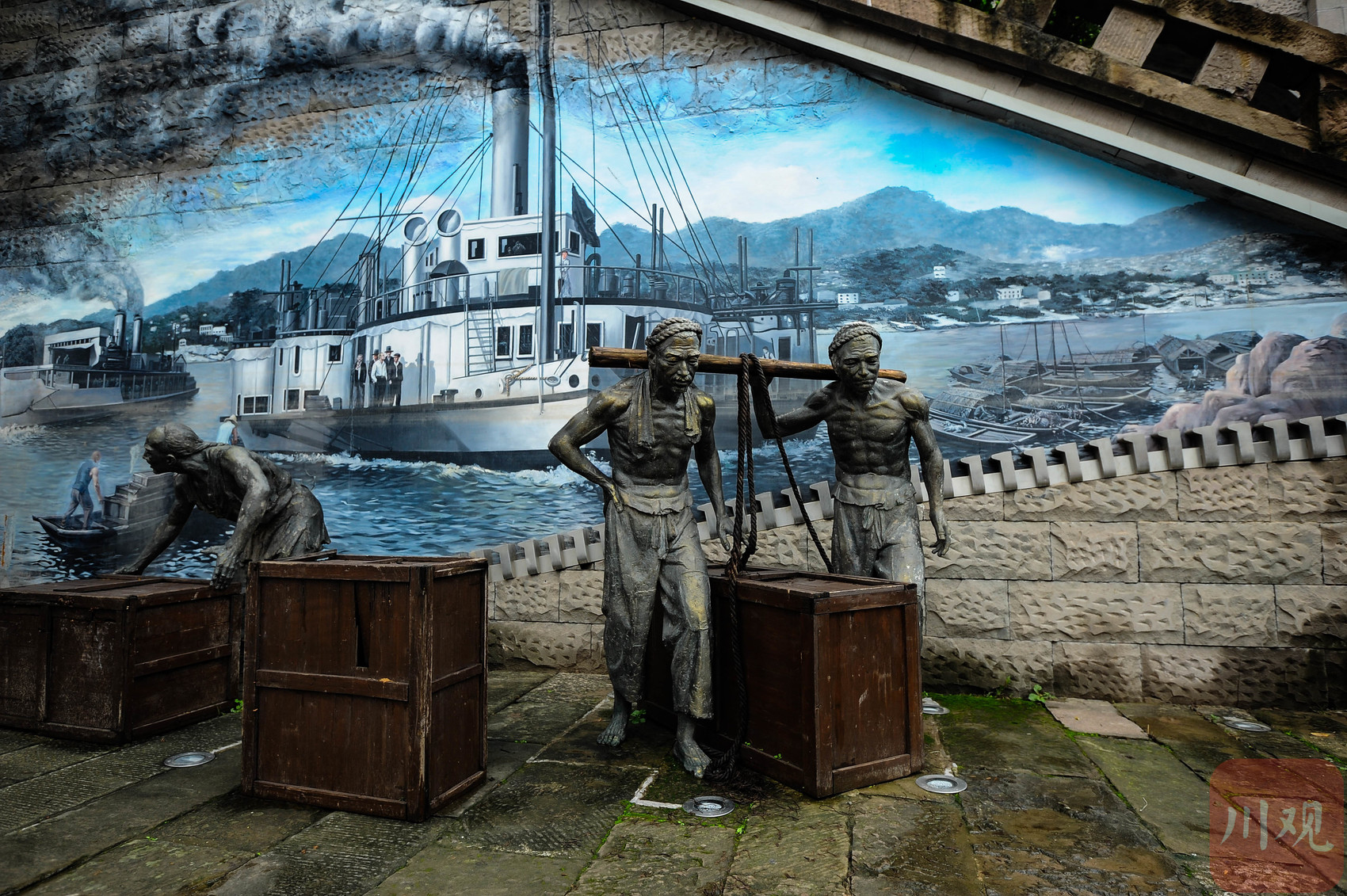 重庆南岸龙门浩老街内,以雕塑与壁画还原的清末开埠码头场景。
