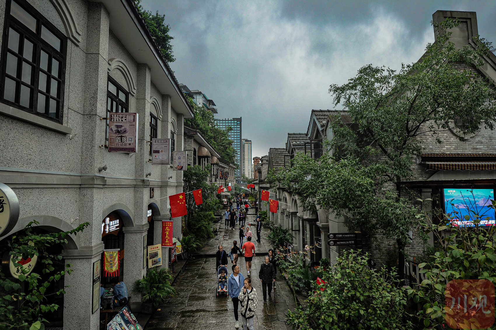 重庆磁器口古镇街巷,游客在挂满店铺招牌的街道上游览。