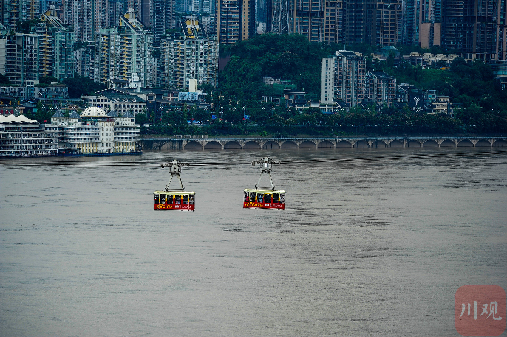 重庆长江索道的两列轿厢在长江上空对向通行。
