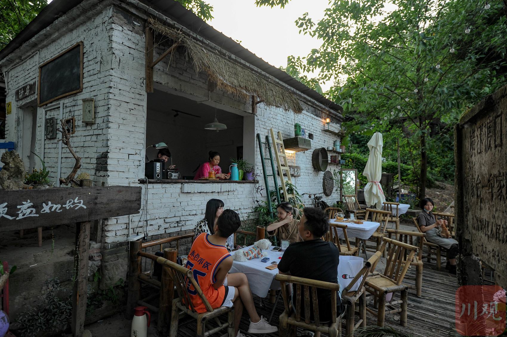 重庆黄桷坪,老厂房改造的户外咖啡馆里,市民围坐竹椅,享受慢时光。