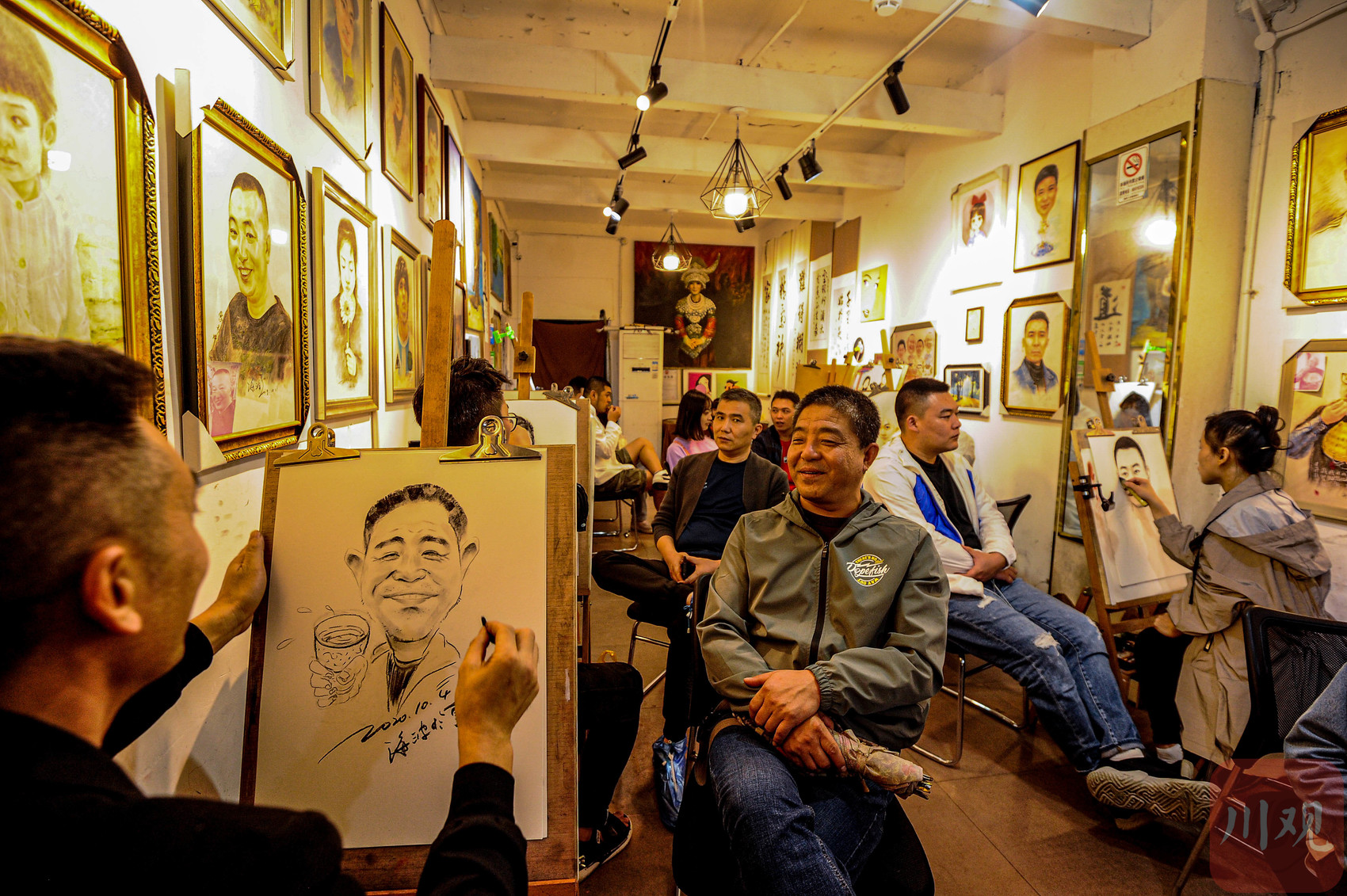 重庆磁器口古镇内的肖像漫画店,画师正在为顾客现场绘制肖像漫画。