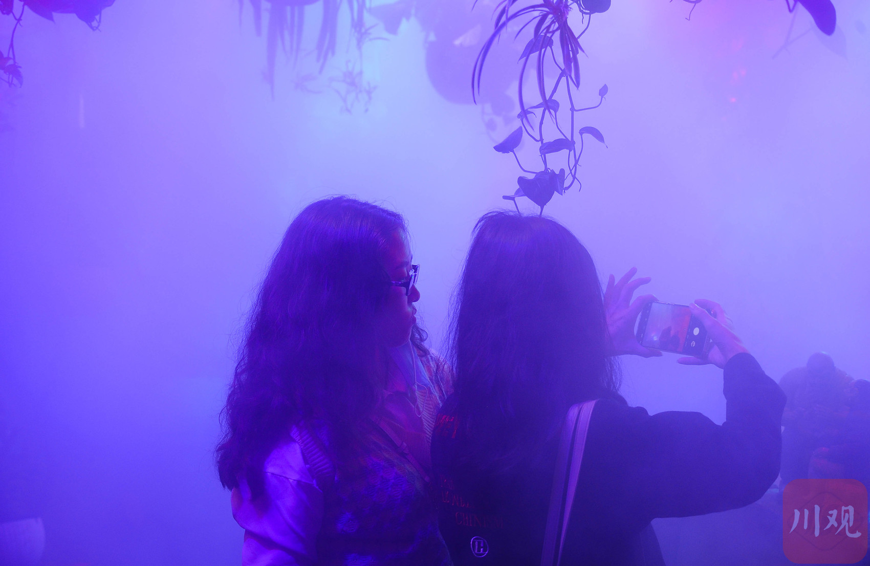 重庆磁器口古镇,游客在沉浸式灯光雾森展中拍照打卡。