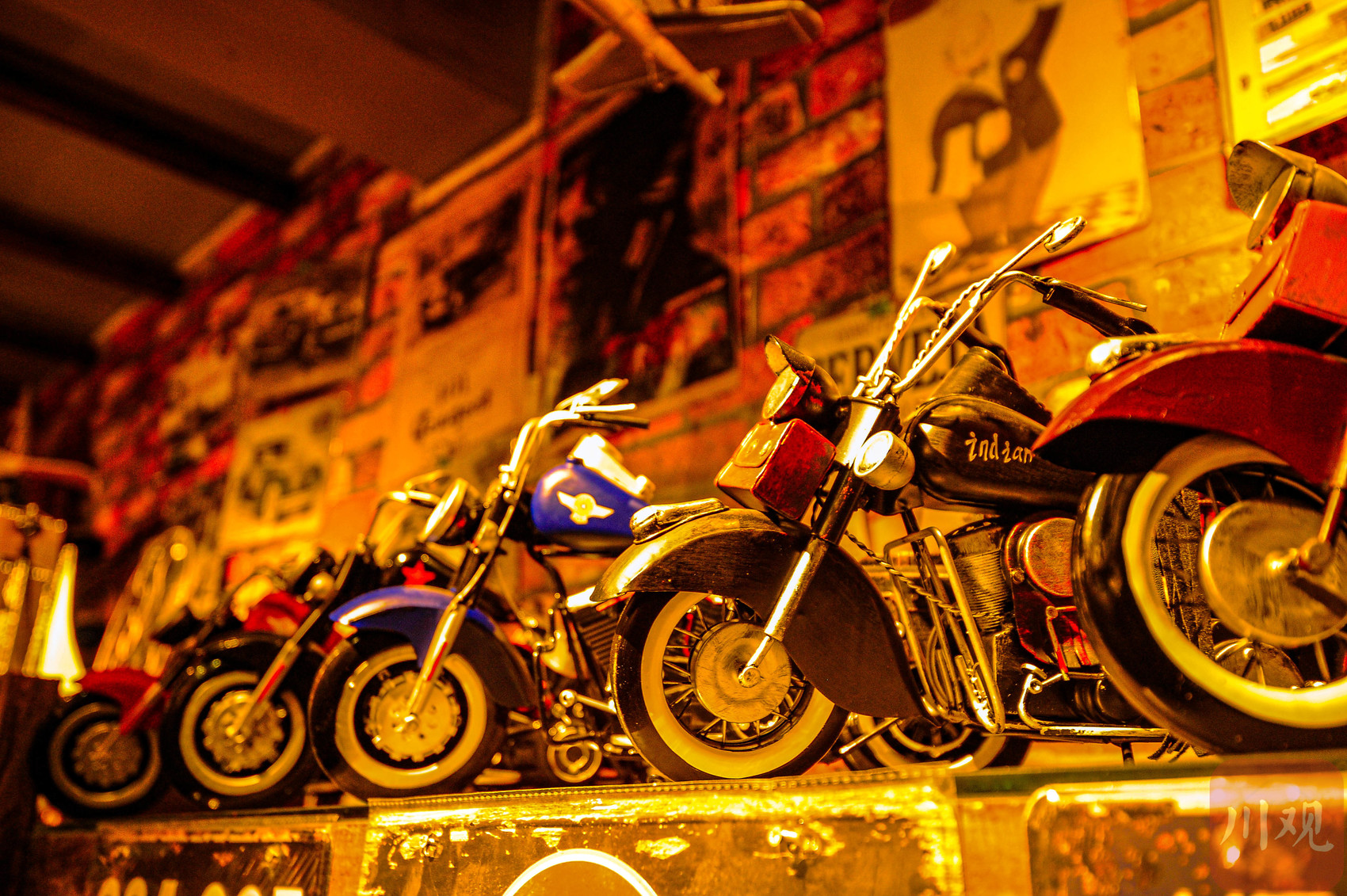 重庆磁器口古镇一家店铺内,陈列着复古摩托车模型摆件。