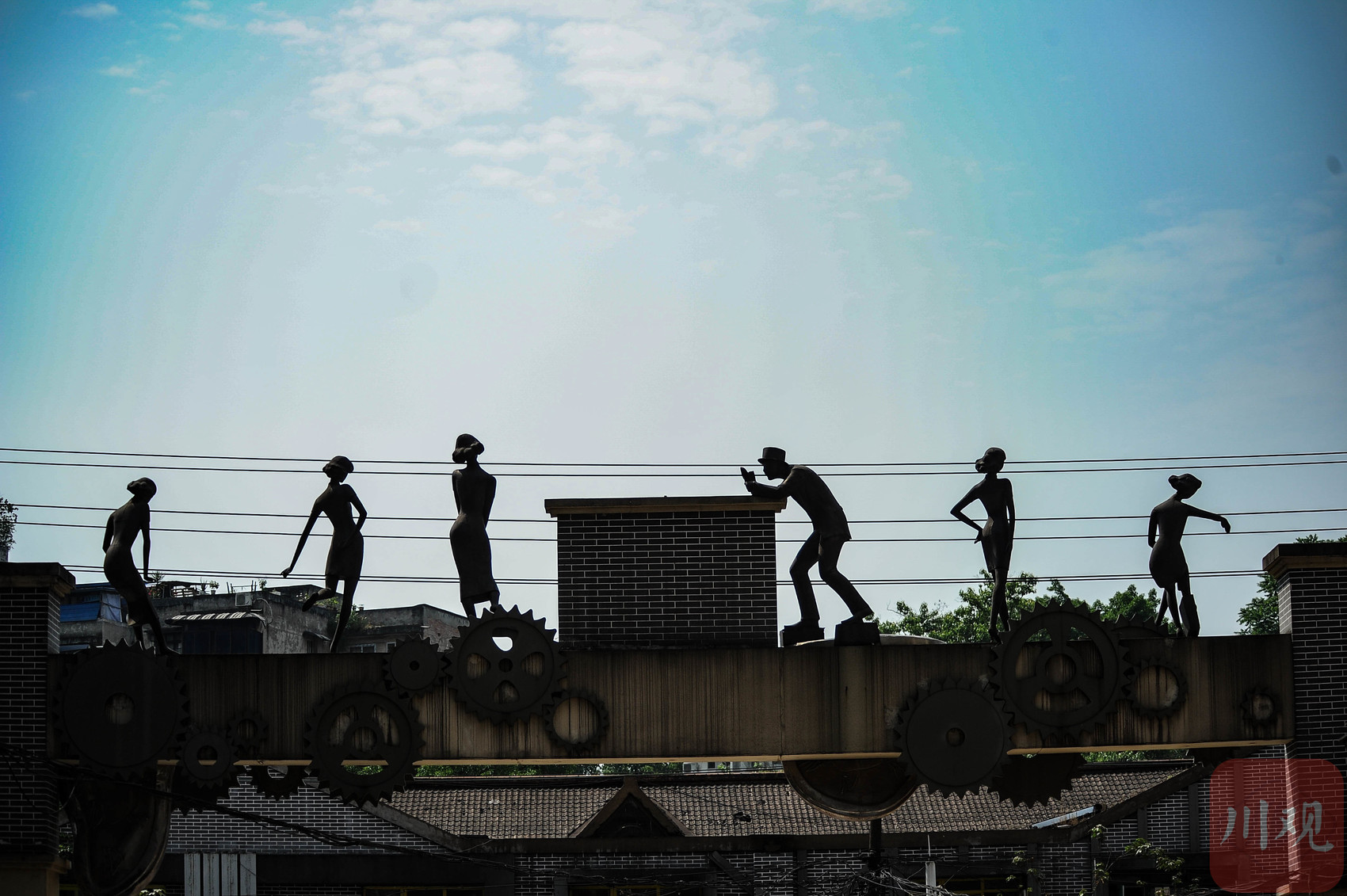 重庆黄桷坪,齿轮背景下的民国风人物剪影雕塑。