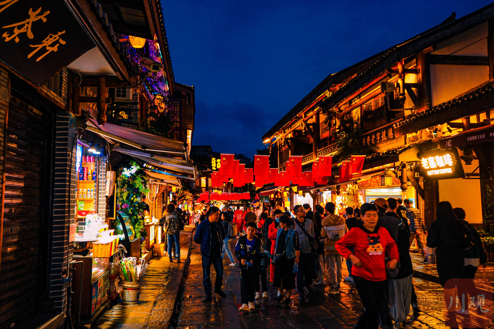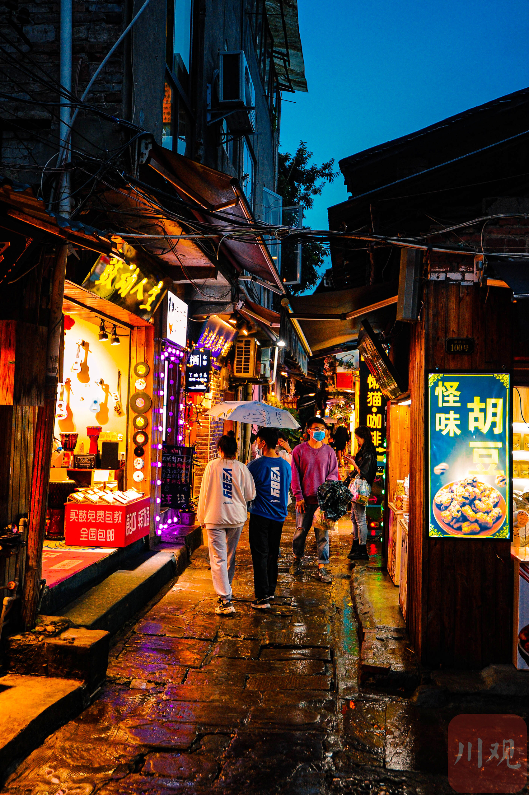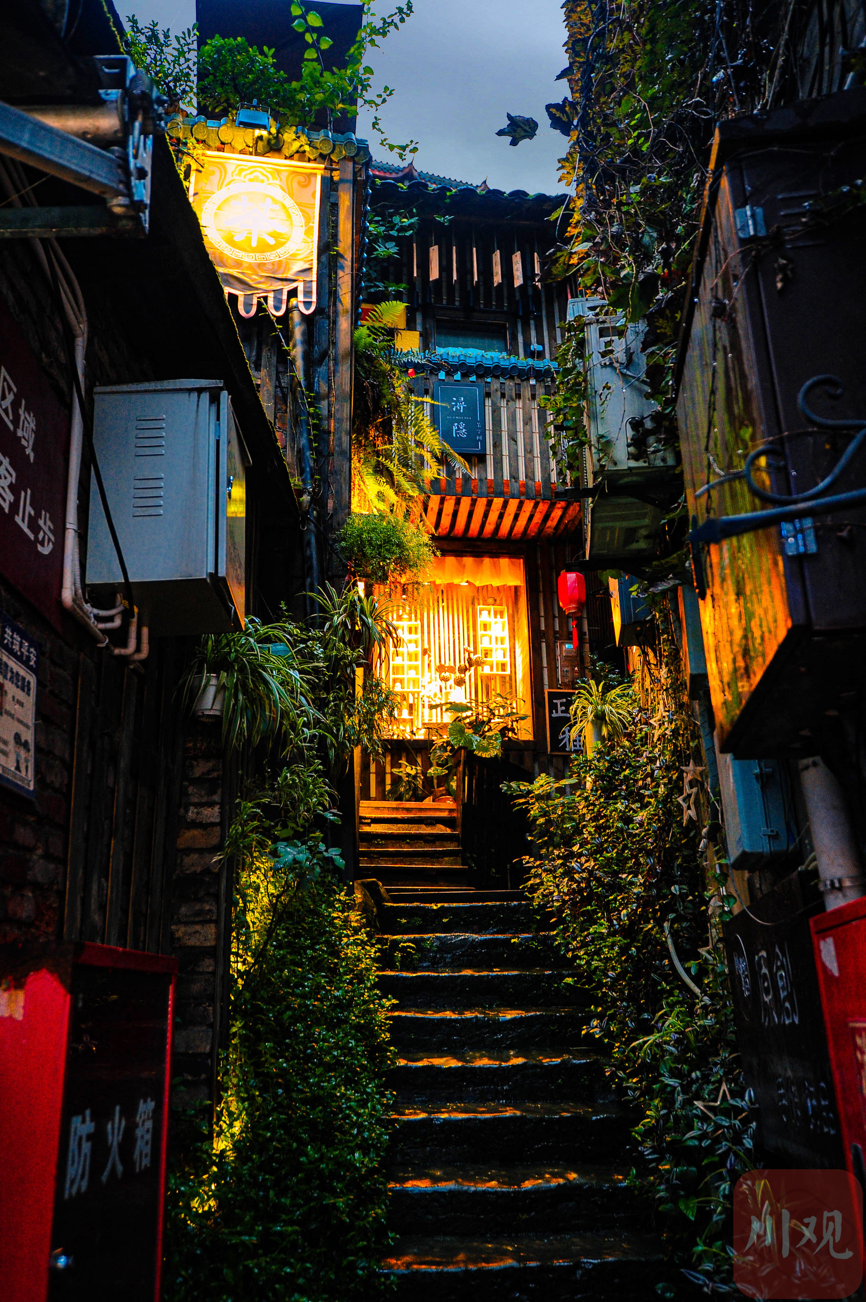 重庆磁器口古镇,一条狭窄小巷内的店铺亮起灯光。