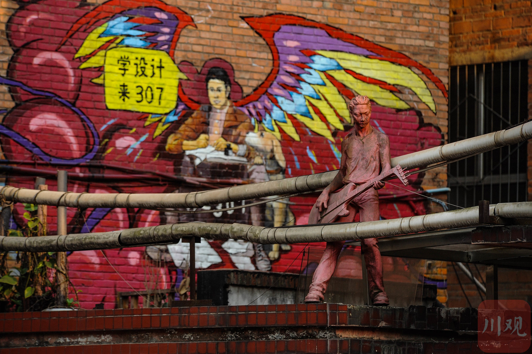 重庆黄桷坪,持吉他的音乐人雕塑与涂鸦墙相映。