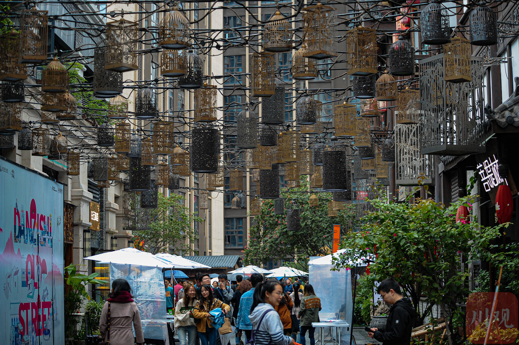 重庆南岸区弹子石老街,特色鸟笼灯饰装点的街巷游人如织。
