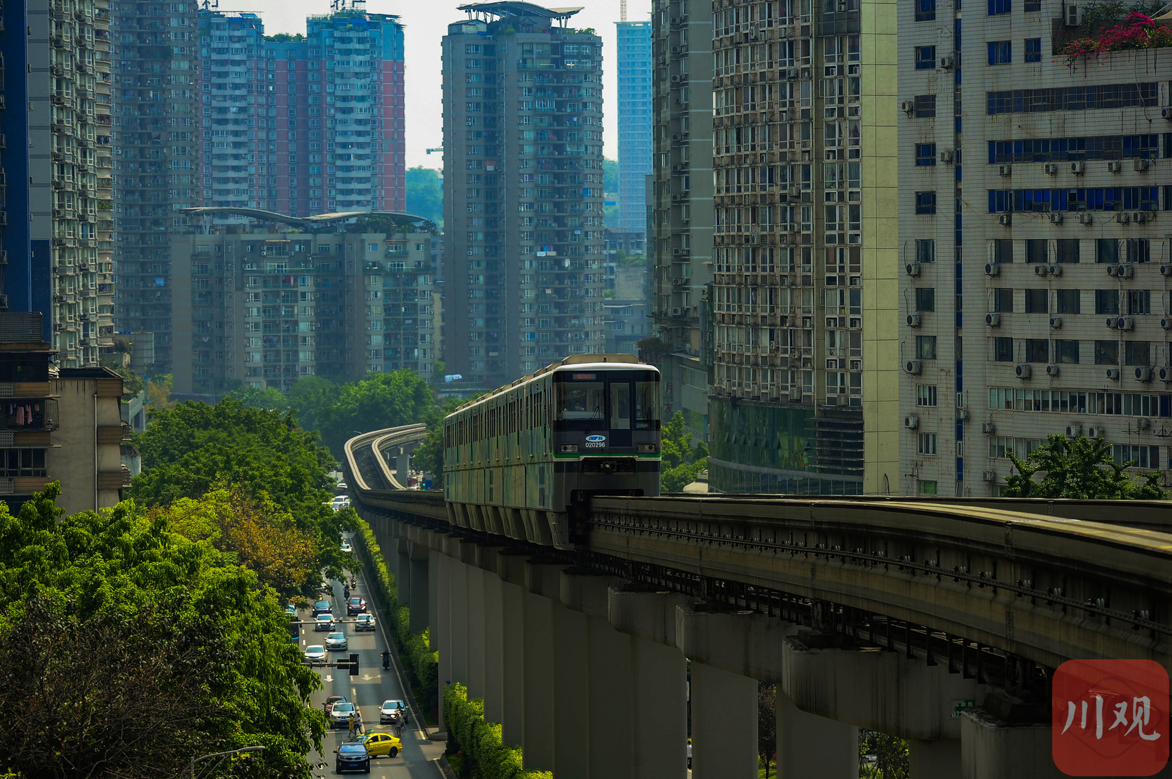 重庆轨道交通2号线列车在高架轨道上运行。
