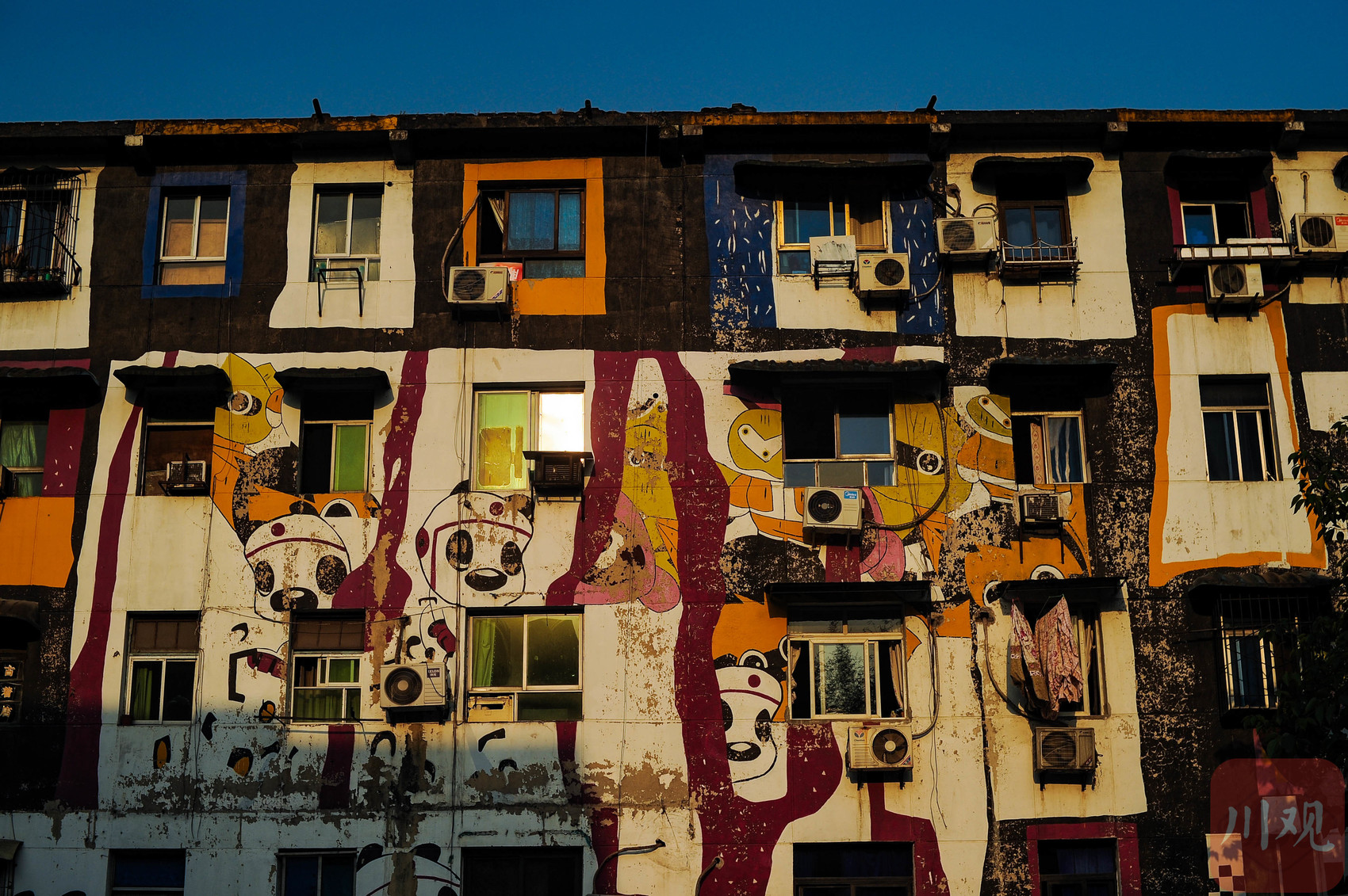 重庆黄桷坪,熊猫涂鸦覆盖的居民楼外墙。