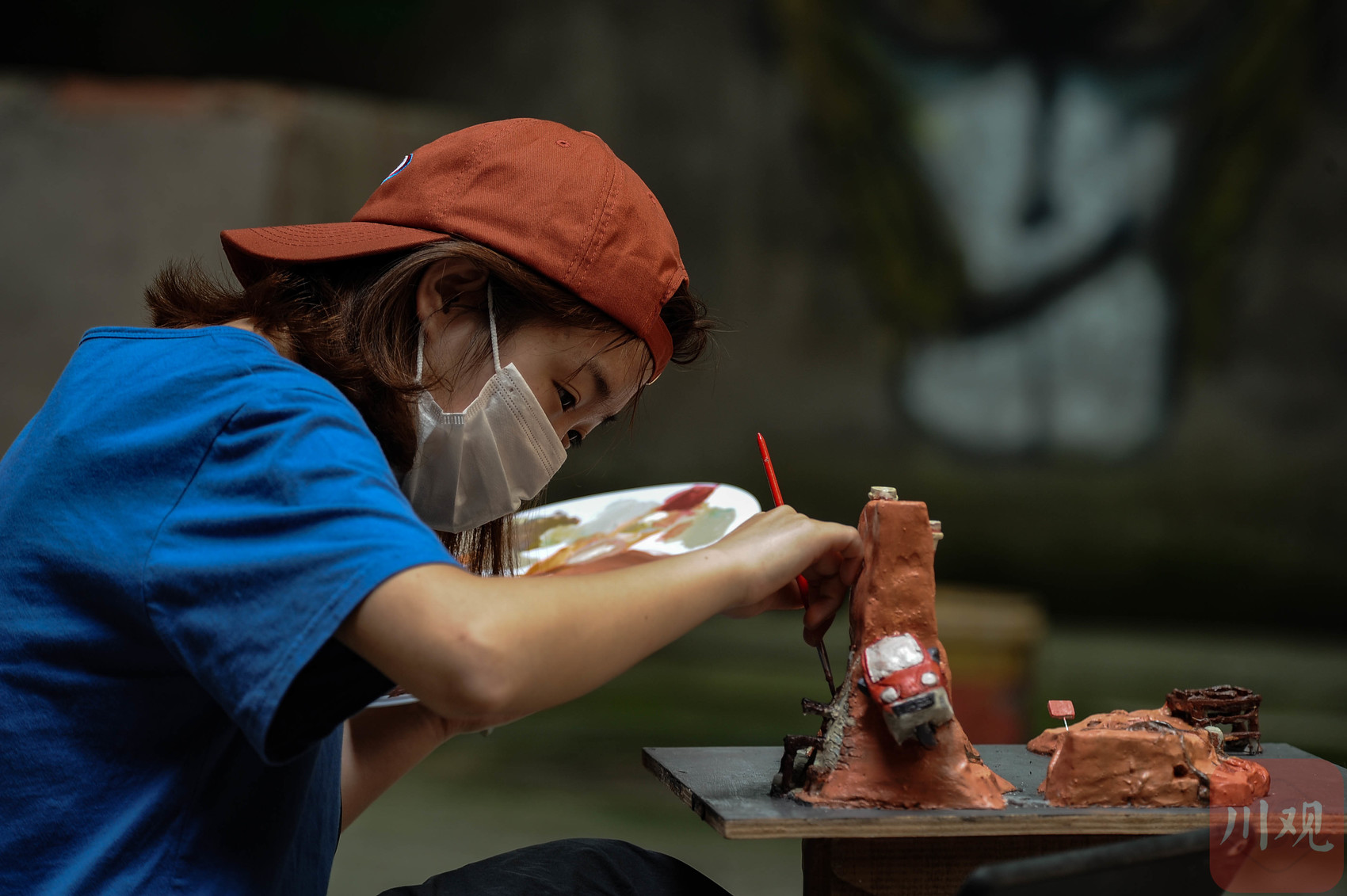 重庆黄桷坪交通茶馆外,一个美院学生正在精心绘制微缩艺术模型。