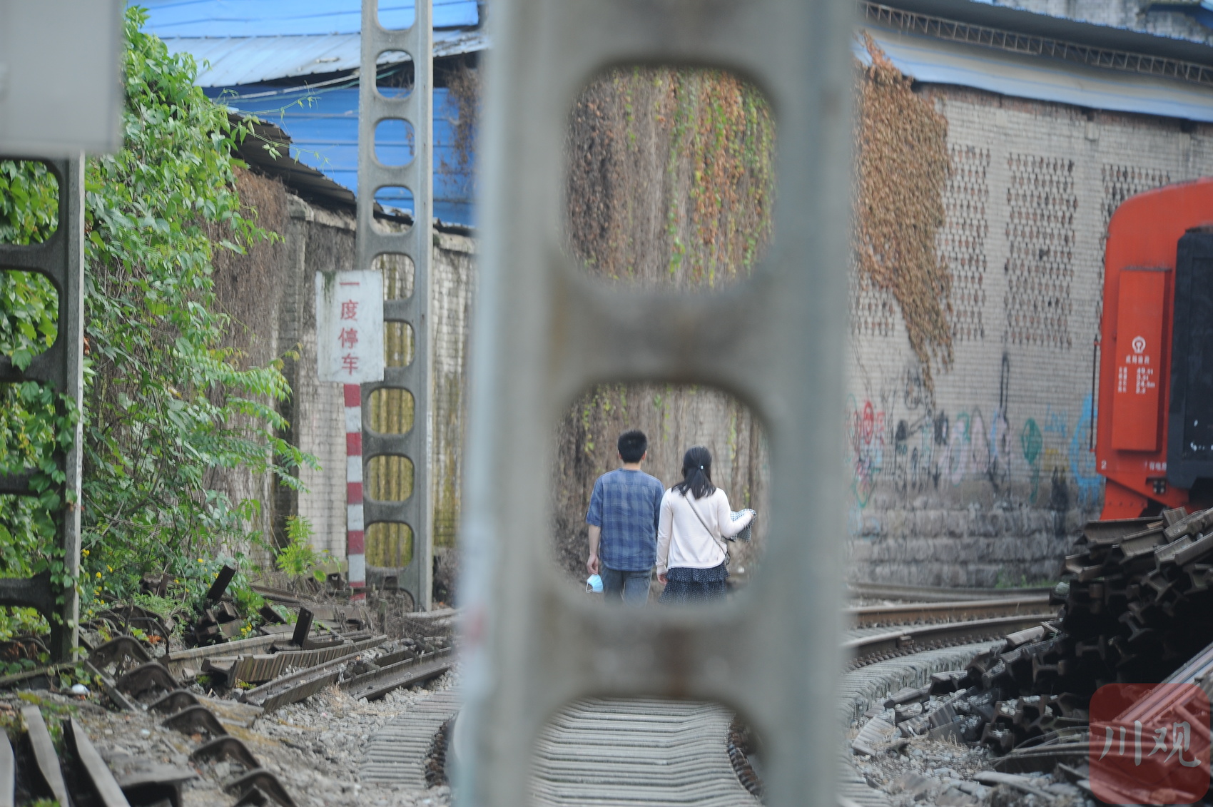 重庆黄桷坪,一对情侣在废弃铁路上并肩漫步,穿过画框般的工业构件,与老火车头相映成景。