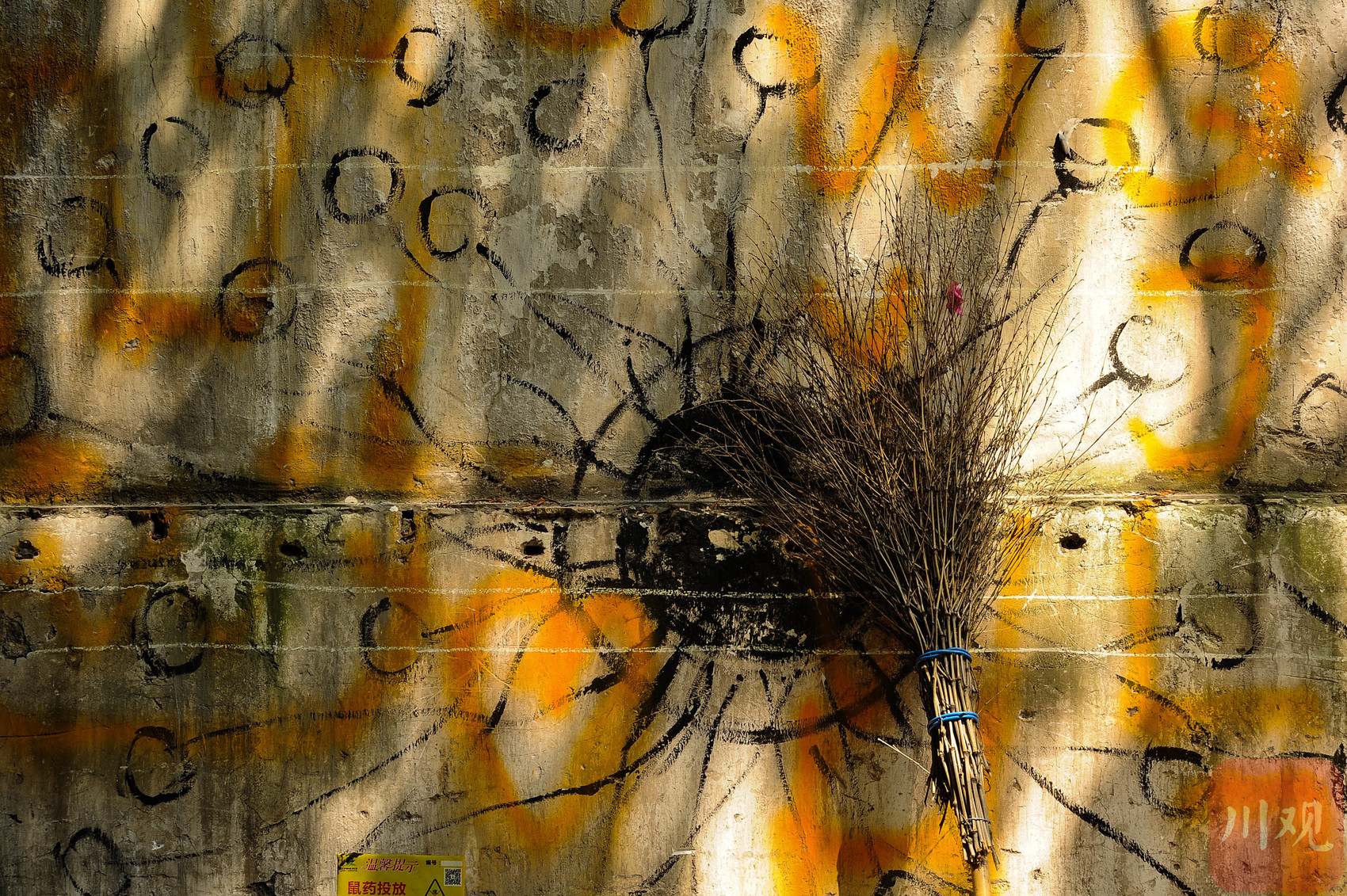 重庆黄桷坪,老墙涂鸦旁斜靠着竹扫帚,在光影斑驳间交织出市井与艺术的诗意瞬间。