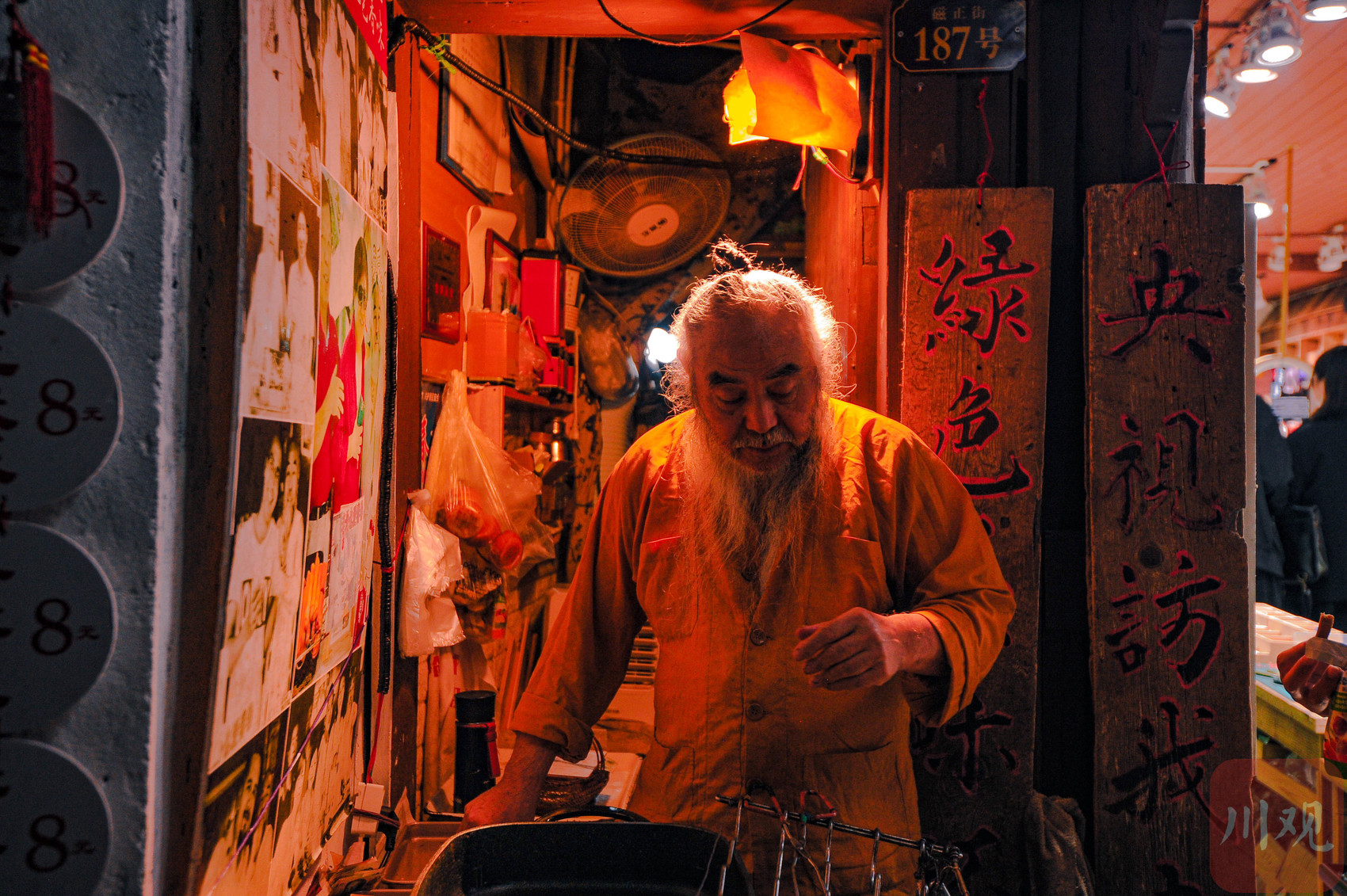 重庆磁器口古镇街巷里,一位经营小吃摊的老人正在摊位前忙碌。