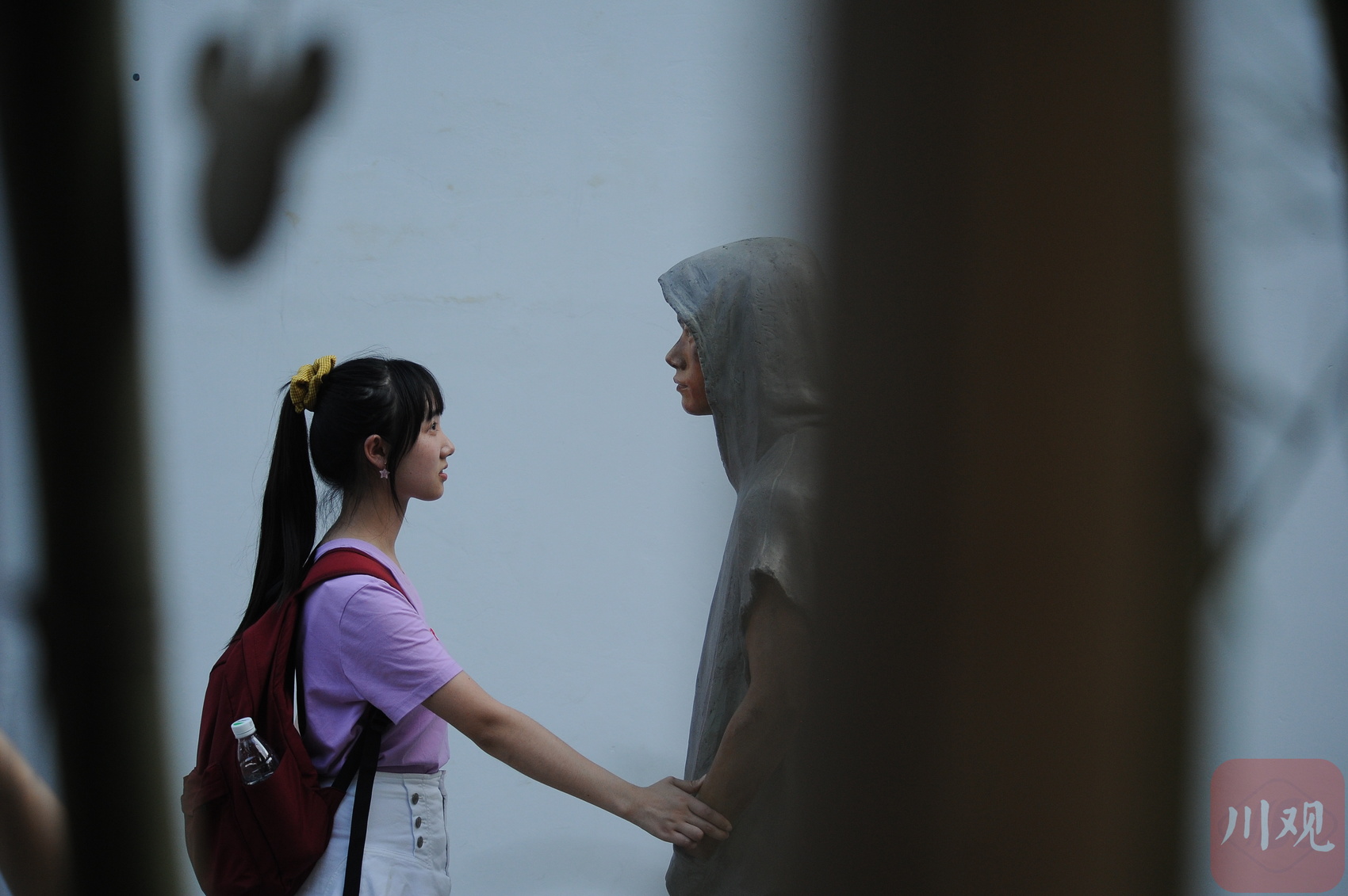重庆黄桷坪街,年轻女孩与连帽人像雕塑 “牵手对视”。