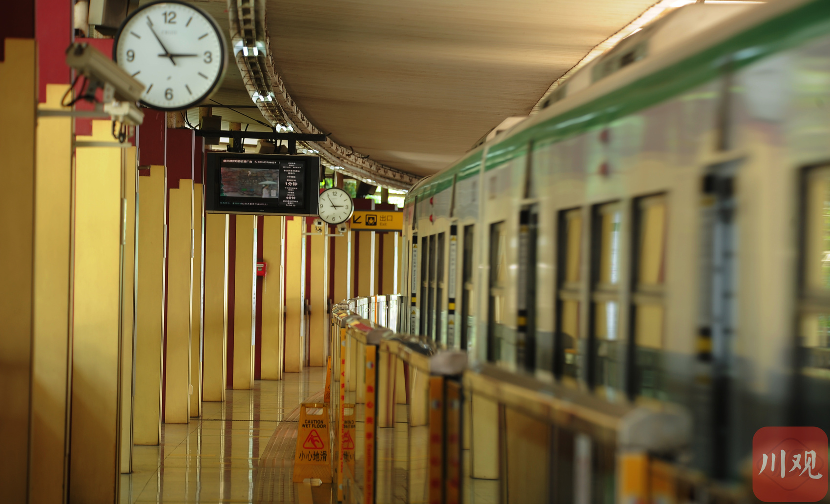 重庆轨道交通2号线李子坝站站台,列车停靠在站台旁。