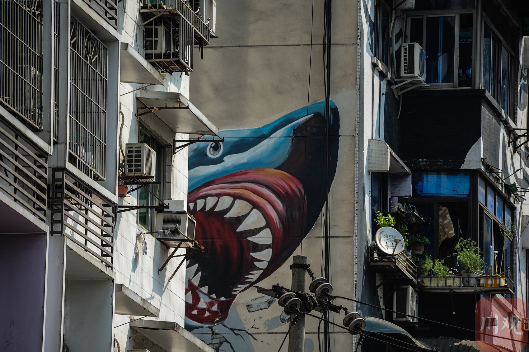 重庆黄桷坪,居民楼墙面上破墙而出的巨鲨涂鸦。