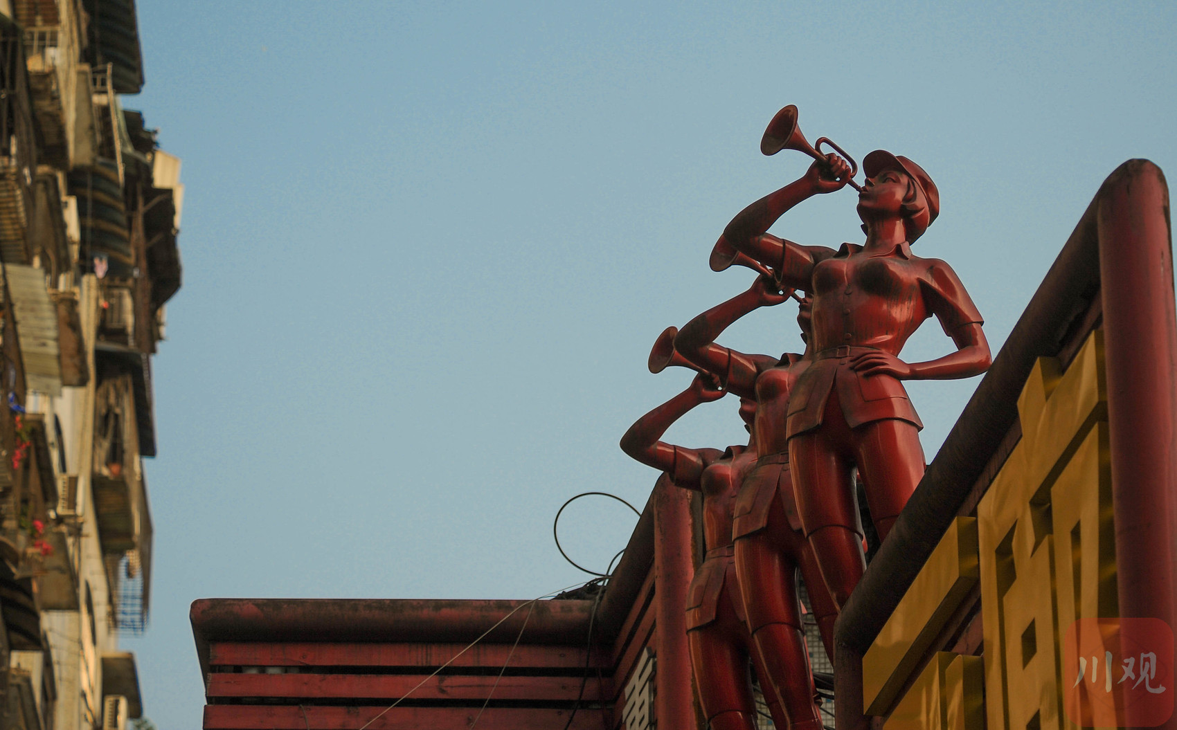 重庆黄桷坪,一组红色吹号女兵雕塑在老建筑与蓝天背景下格外醒目。