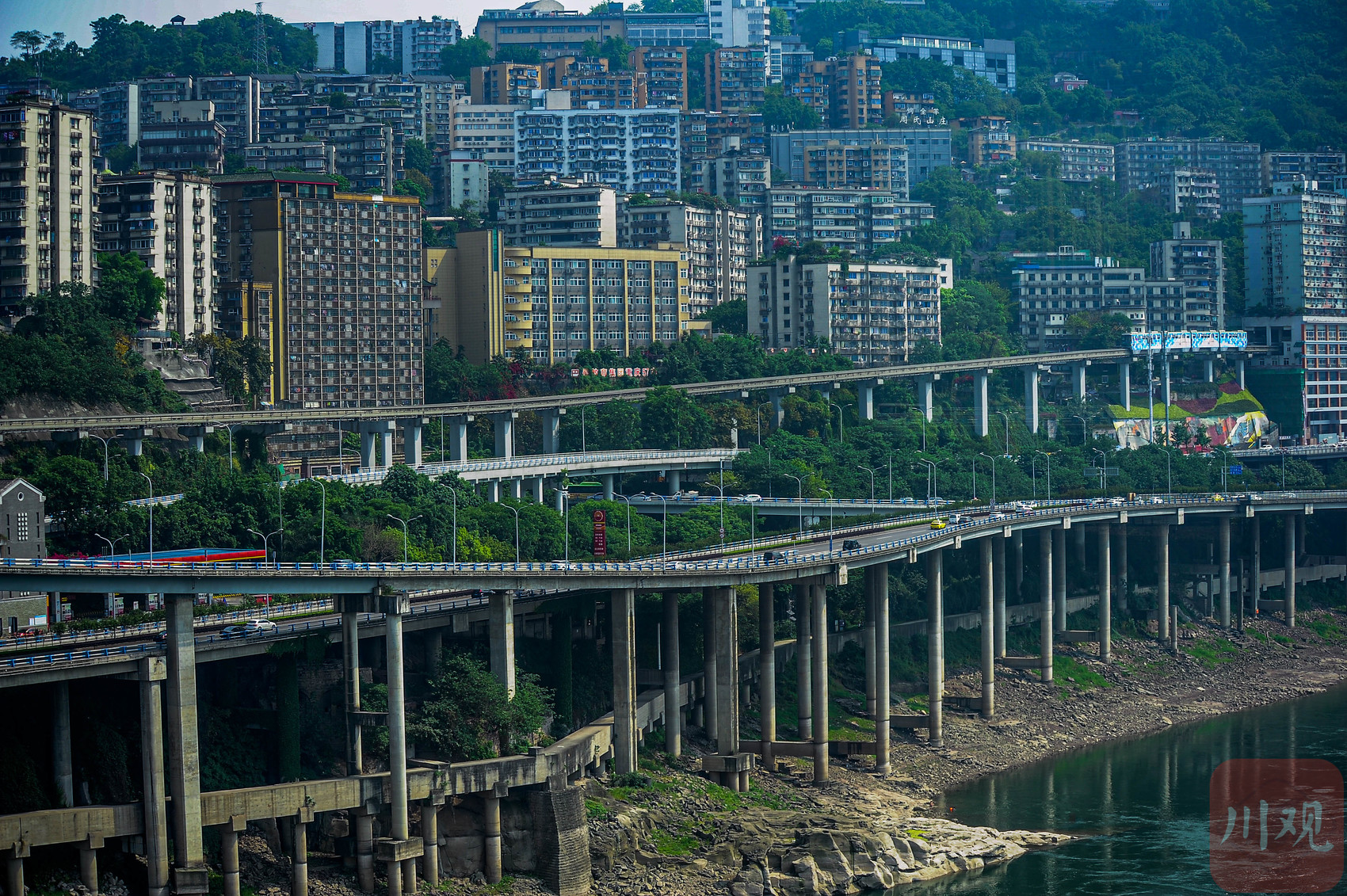 重庆渝中区,嘉陵江边多层高架道路及轨道交通设施景观。