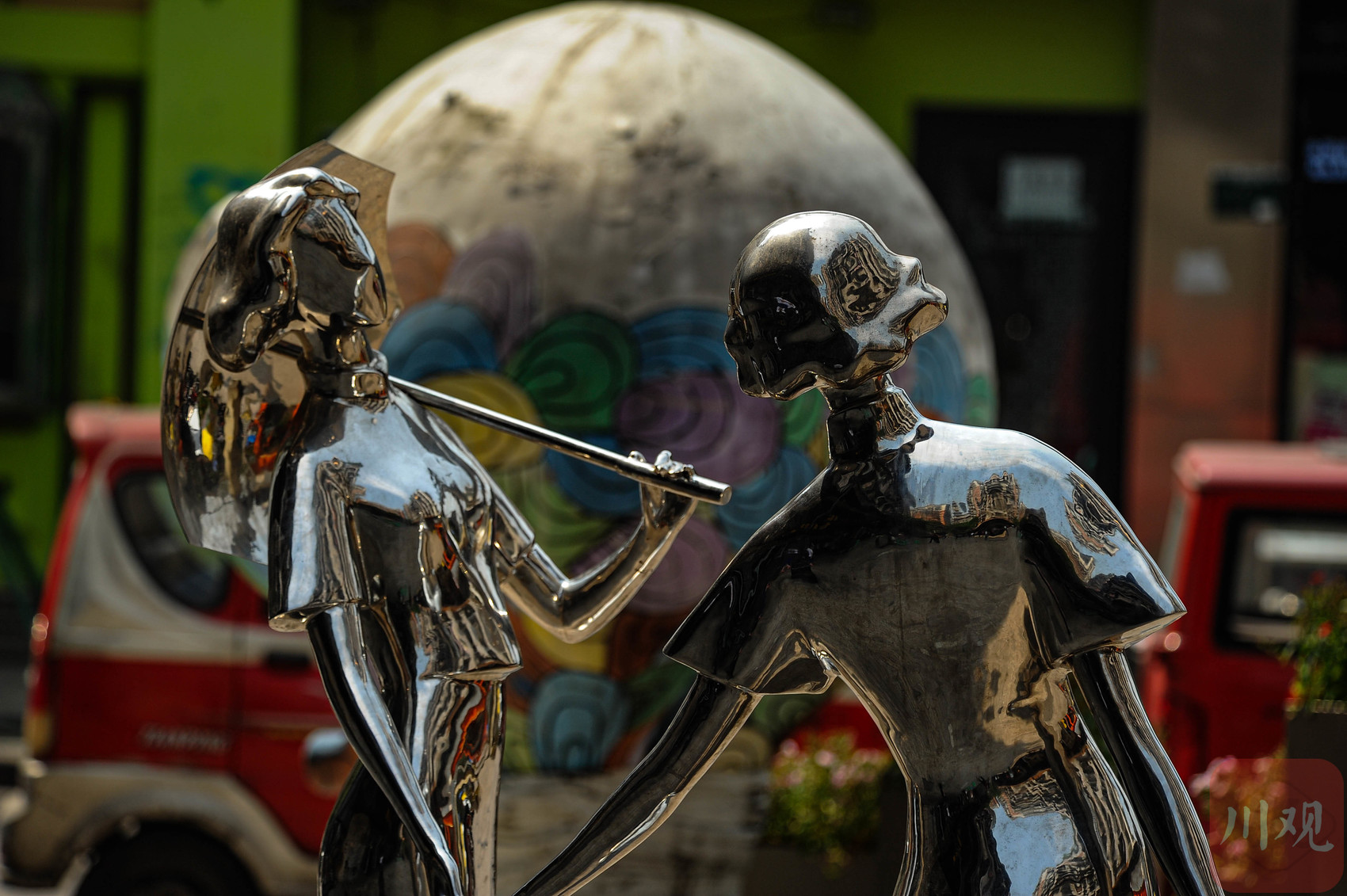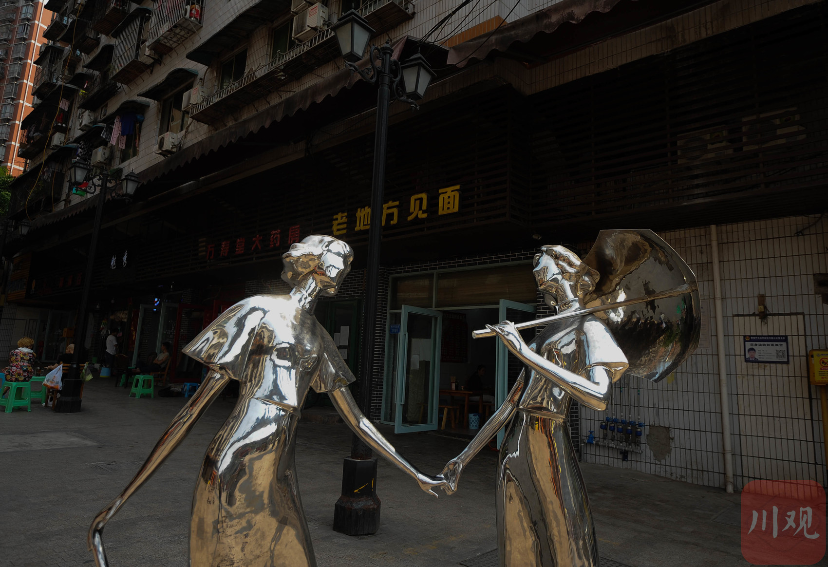 重庆黄桷坪,牵手而行的镜面不锈钢女子雕塑,在市井街巷中泛着艺术光泽。