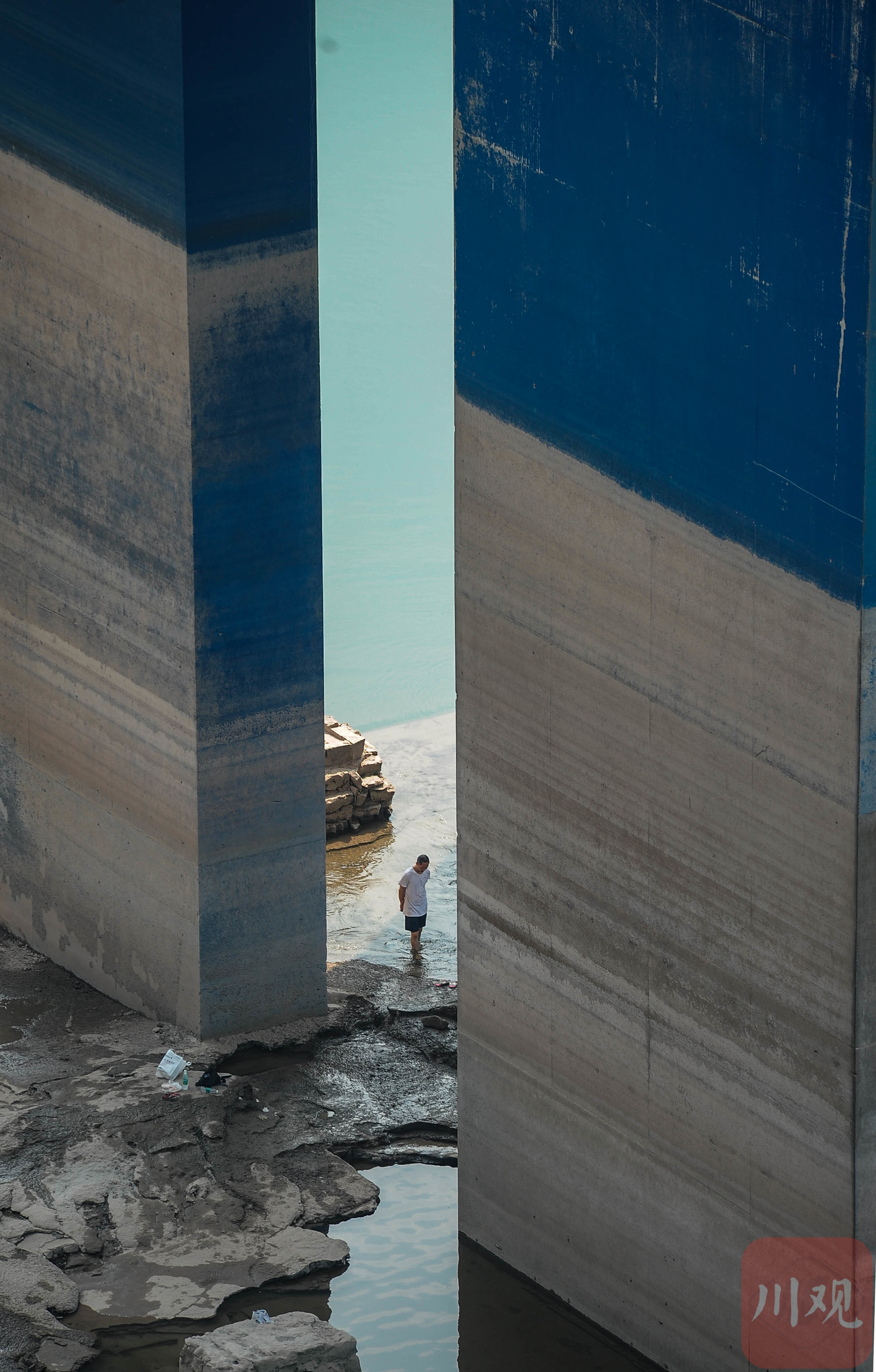 重庆长江边的大桥桥墩间,一名男子在浅滩涉水。