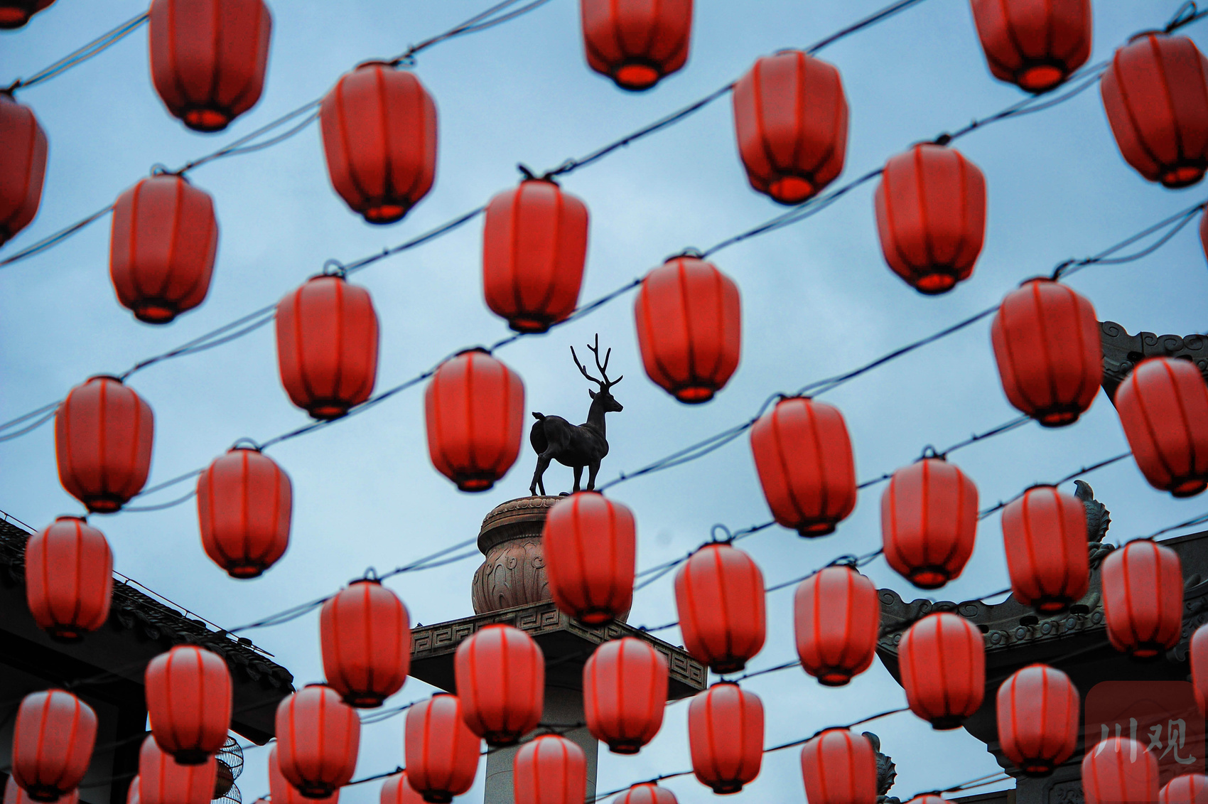 重庆南岸弹子石老街,红灯笼下可见鹿形雕塑。
