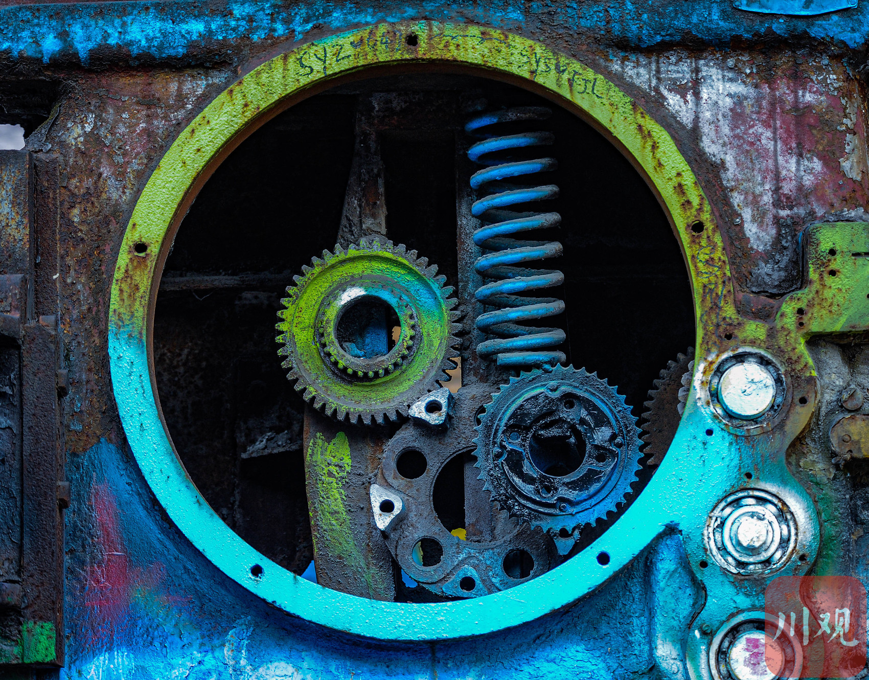 重庆黄桷坪,旧工业齿轮被涂鸦改造的艺术装置。