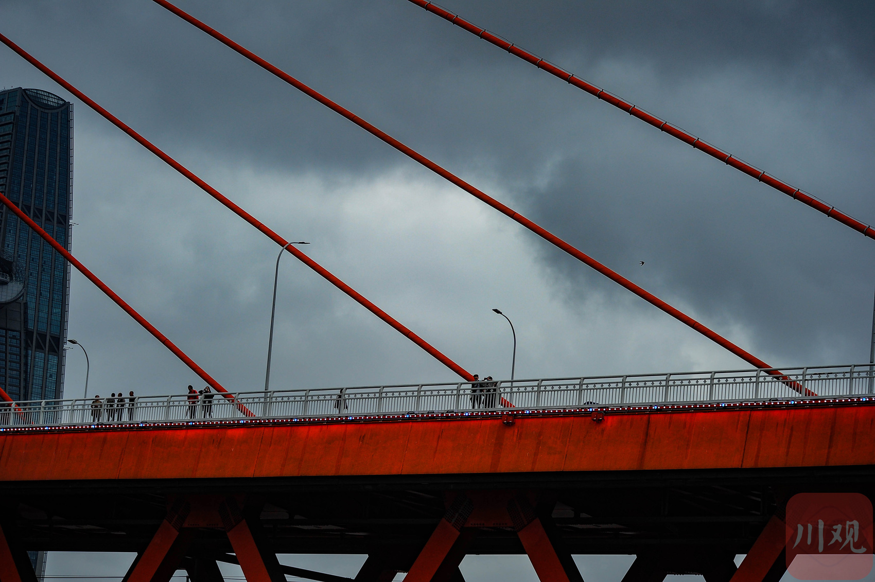 重庆东水门长江大桥桥面,行人在桥上通行。