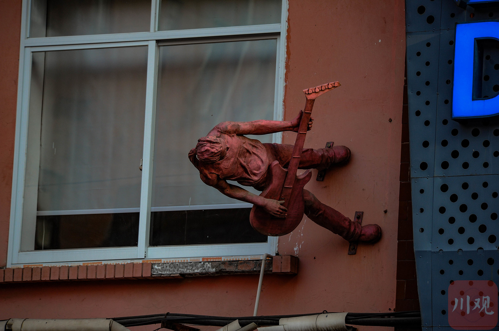 重庆黄桷坪,墙上 “破墙而出” 的吉他手雕塑。