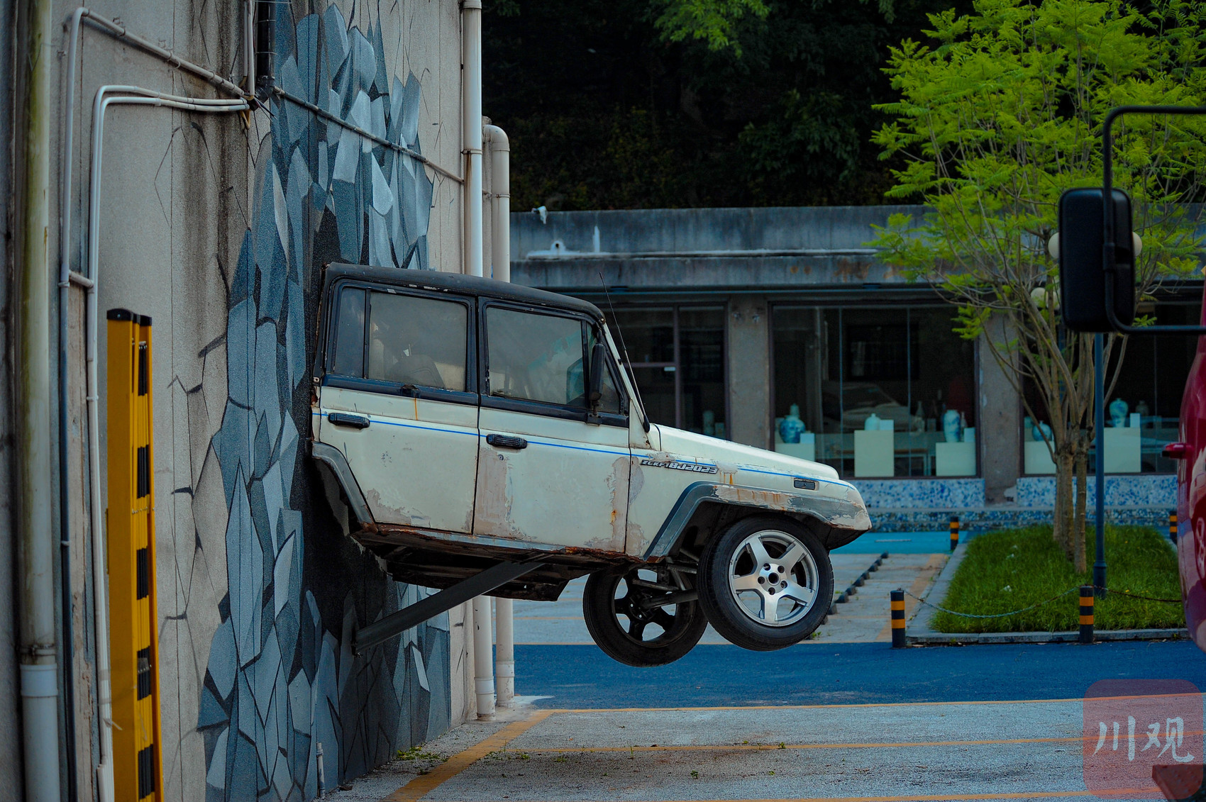 重庆黄桷坪,一辆老式吉普车 “穿墙而出” 的创意装置艺术景观。