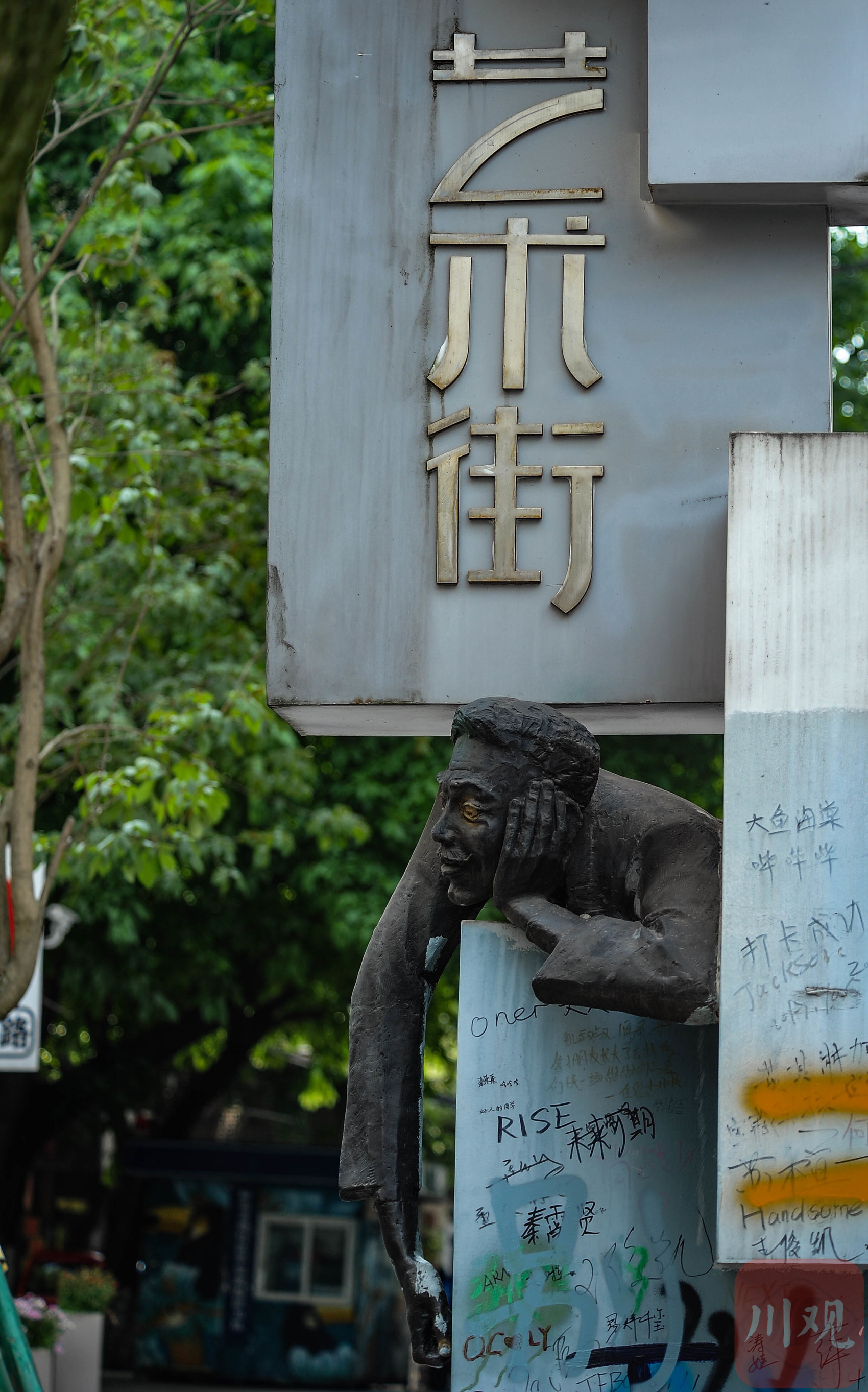 重庆黄桷坪街上,女性舞者造型雕塑别致亮眼。