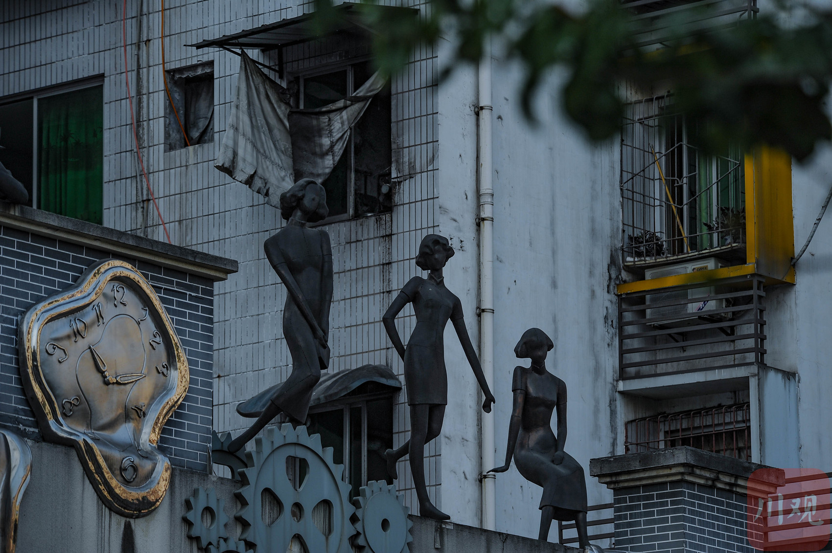 重庆黄桷坪,一组融合达利风格扭曲时钟、齿轮与旗袍女性形象的现代雕塑。