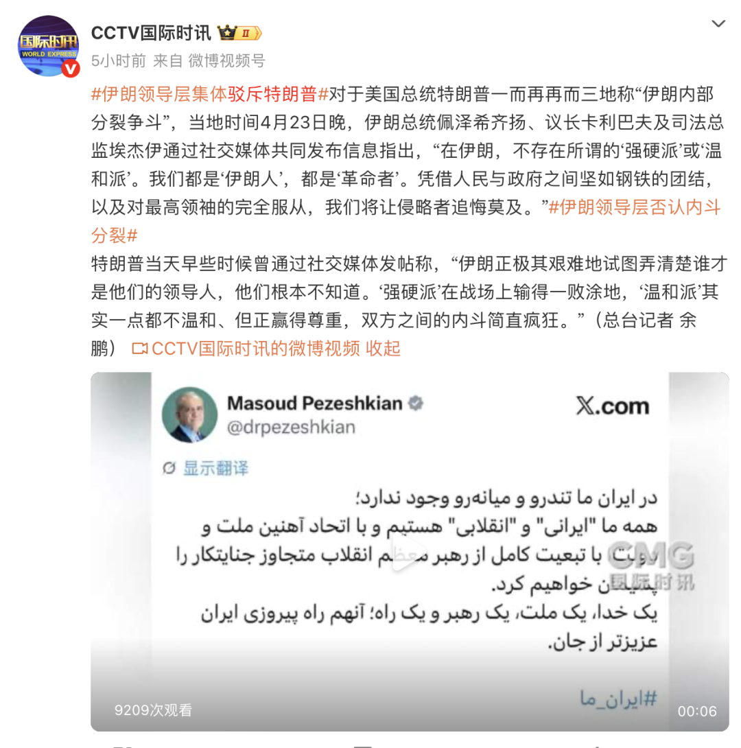 对于美国总统特朗普一而再再而三地称“伊朗内部分裂争斗”,当地时间4月23日晚,伊朗总统佩泽希齐扬、议长卡利巴夫及司法总监埃杰伊通过社交媒体共同发布信息指出,“在伊朗,不存在所谓的‘强硬派’或‘温和派’。我们都是‘伊朗人’,都是‘革命者’。凭借人民与政府之间坚如钢铁的团结,以及对最高领袖的完全服从,我们将让侵略者追悔莫及。”