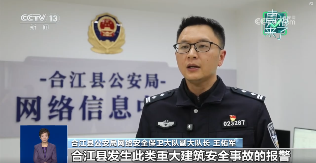 合江县公安局网络安全保卫大队副大队长王佑军:我们第一眼看到这段视频,就判断它是AI合成的,因为视频左下角有明显的AI生成提示标识。但对普通群众来说,对AI合成技术的识别能力有限,分辨不出视频的真假,所以还是引发了大量群众的担忧和网络热议。同时,我们也全面查询了辖区内的接警记录,确认没有收到任何关于合江县发生此类重大建筑安全事故的报警,这进一步印证了视频的虚假性。