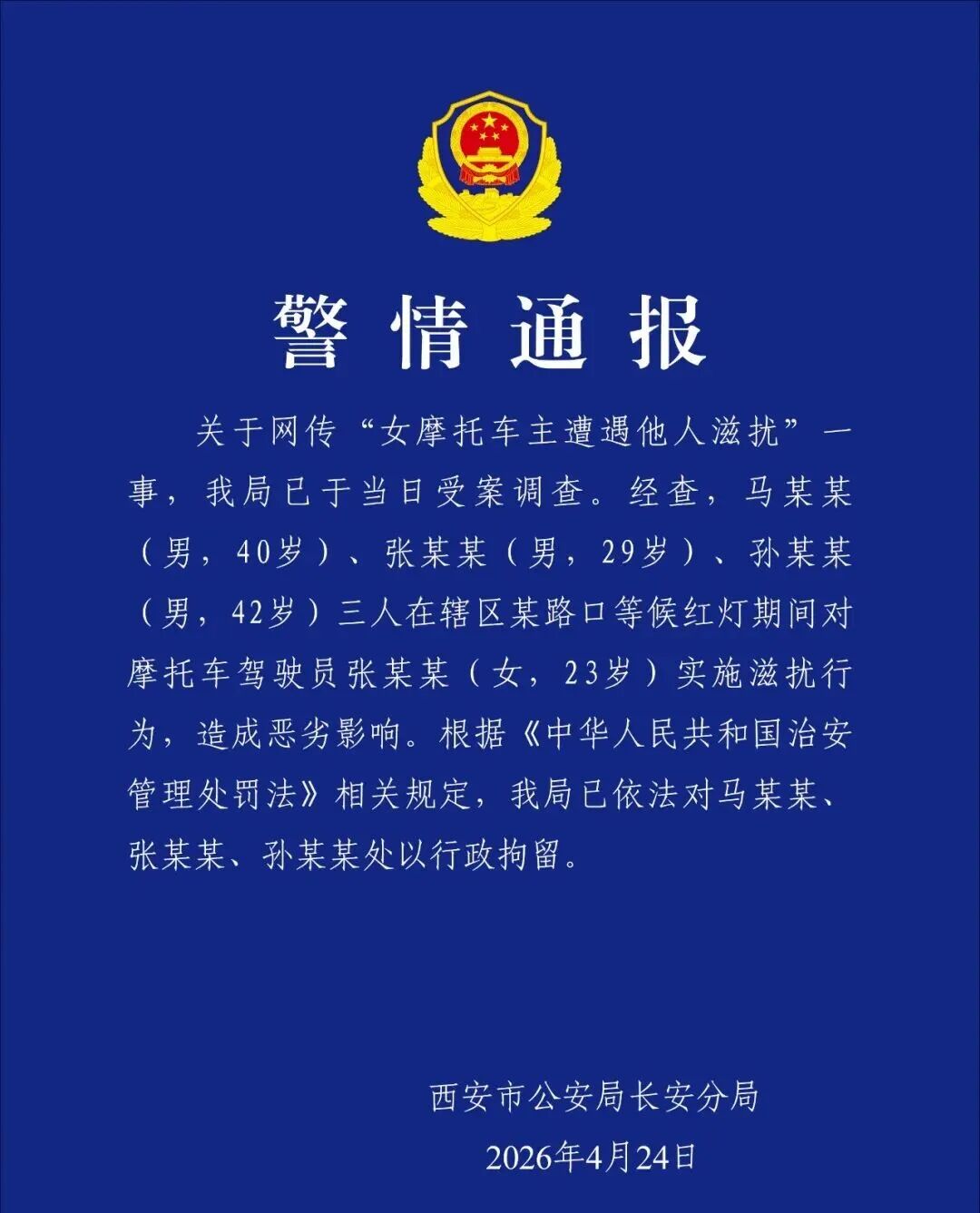 4月24日,西安市公安局长安分局发布警情通报: