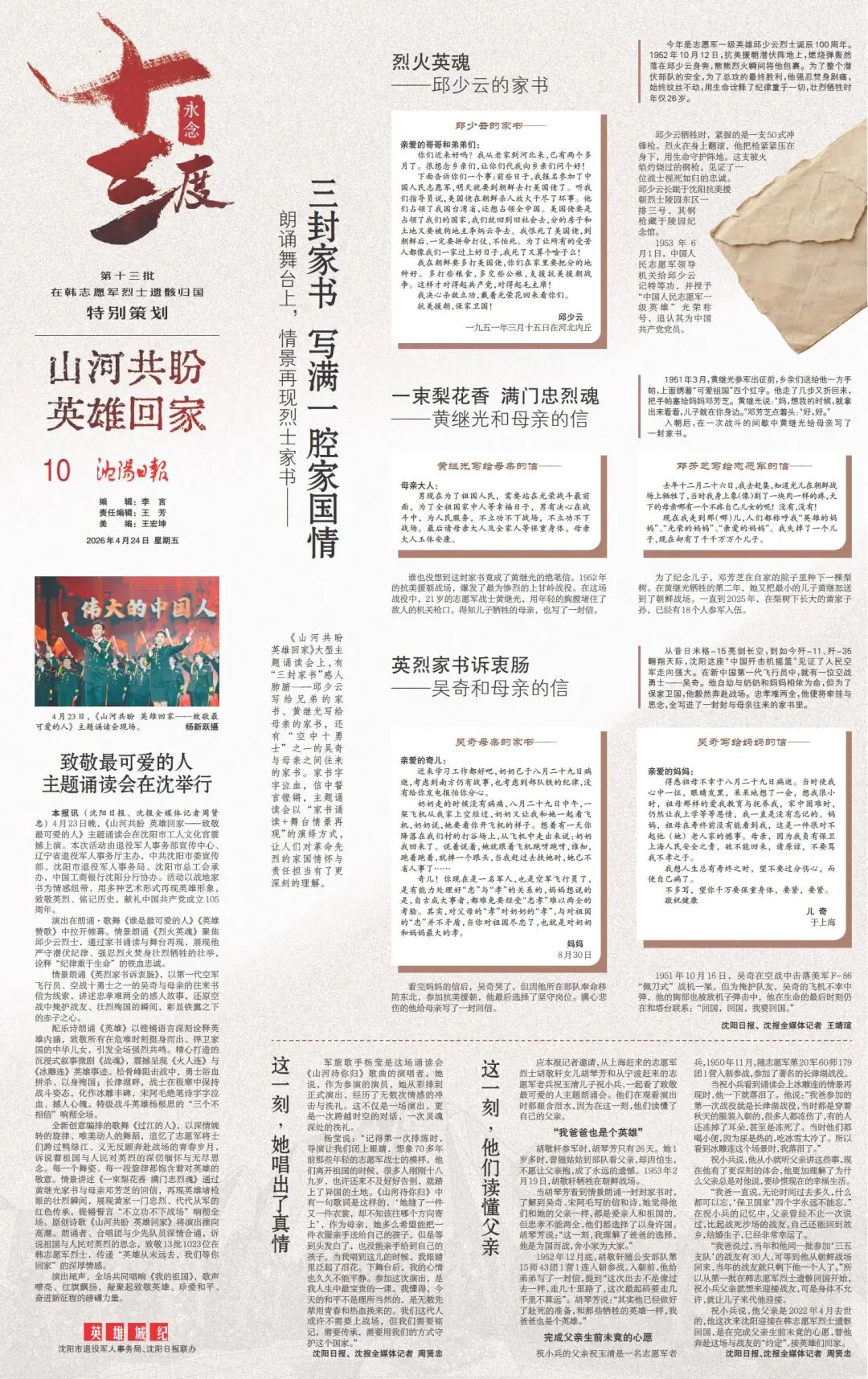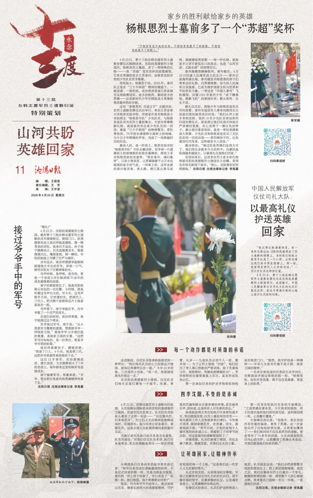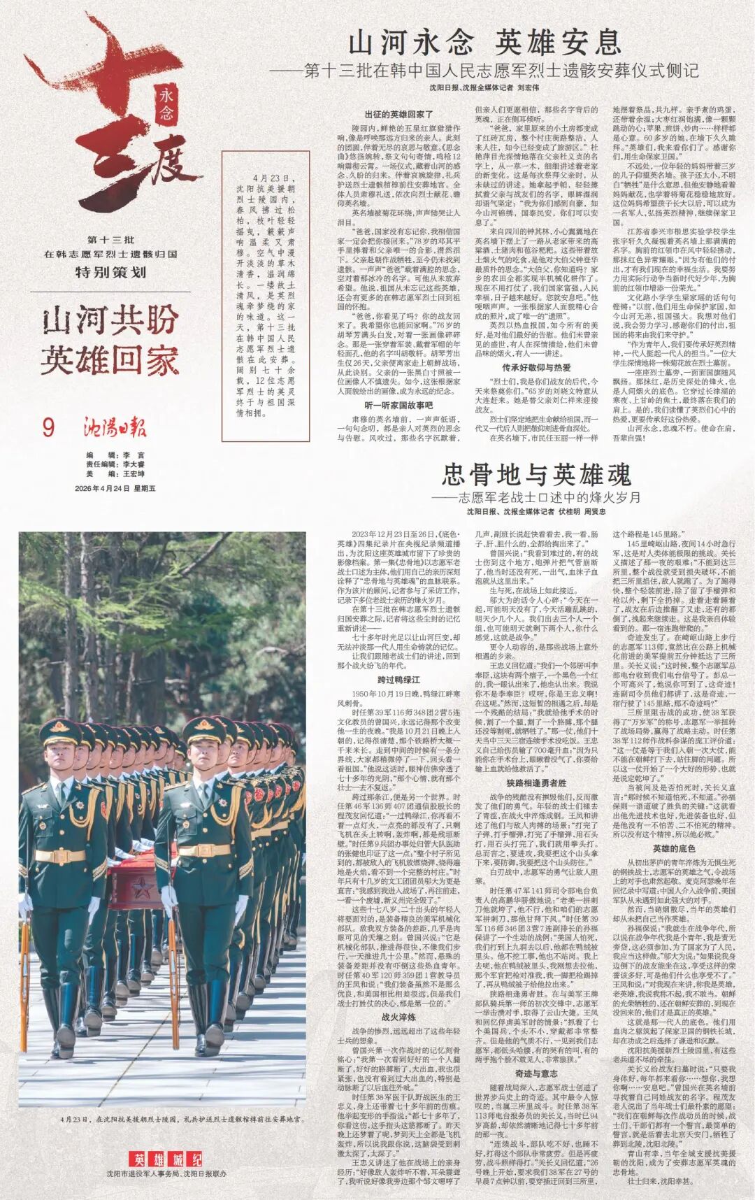 4月22日至23日,第十三批在韩中国人民志愿军烈士遗骸归国安葬。运-20B划破沈阳长空,“双20”编队低空通场,礼兵怀抱国旗覆盖的棺椁缓缓走下舷梯,无数国人的心被同一种情感牵动。