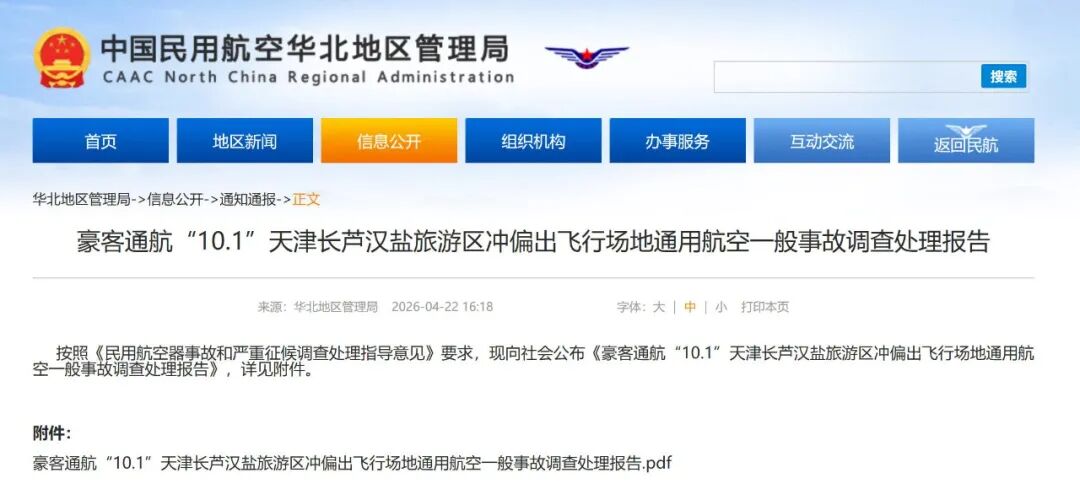4月22日,中国民用航空华北地区管理局在其官方网站发布《豪客通航“10·1”天津长芦汉盐旅游区冲偏出飞行场地通用航空一般事故调查处理报告》。