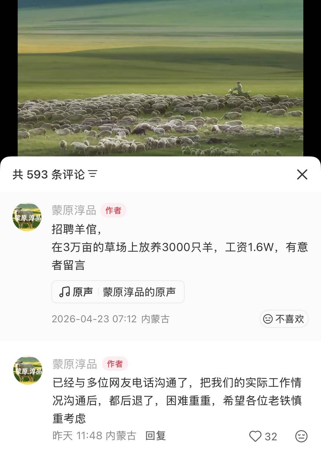 4月23日一早,左先生在社交平台上发布了招聘信息,很简单:在3万亩的草场上放养3000只羊,工资1.6W,有意者留言。