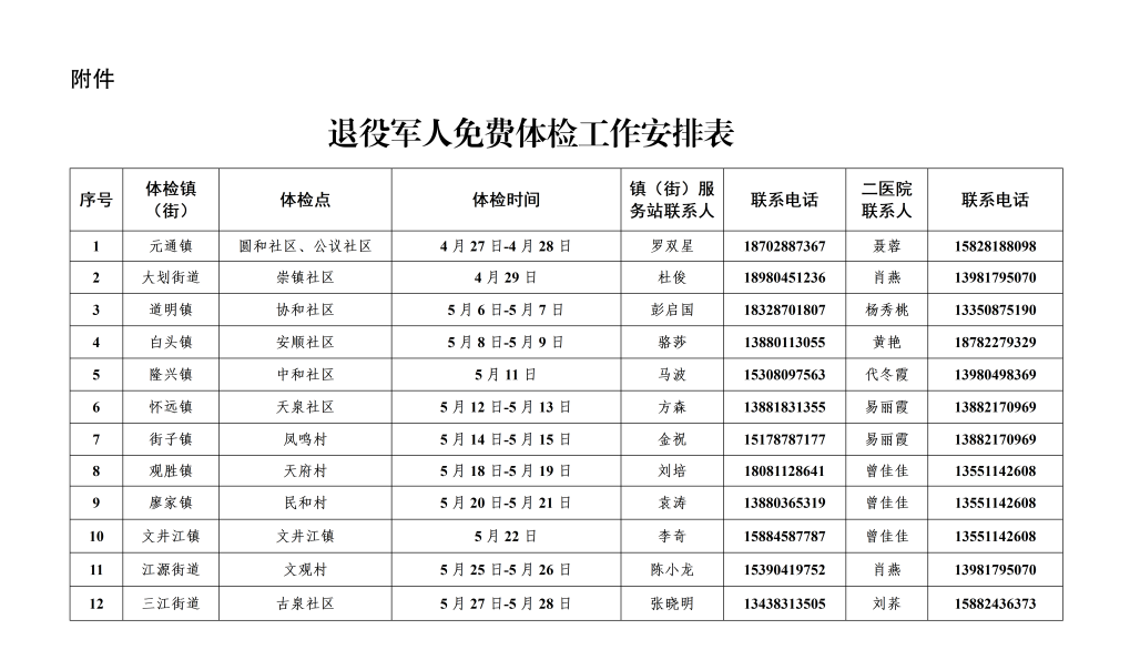 据悉,此次活动采取“下乡集中+院区日常”相结合的方式,分为上半年和下半年开展免费体检。上半年体检期为4月27日至5月28日,具体时间以各镇(街道)村(社区)通知为准;下半年体检期为10月8日至11月30日,采取提前预约,自行前往崇州二医院健康管理中心进行体检(崇州市唐安西路431号),主要为崇阳街道、崇庆街道、羊马街道退役军人提供免费体检服务。