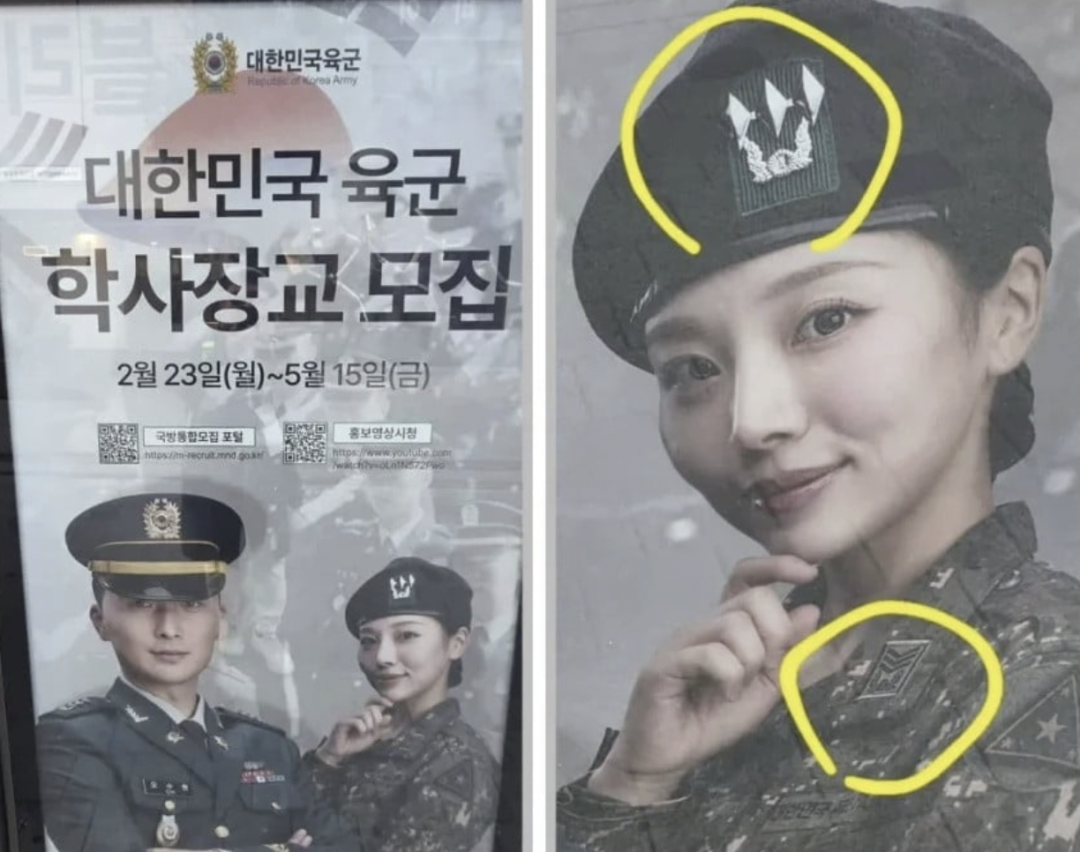 韩国陆军发布的一则学士军官招生海报因模特军衔佩戴不符,加上女性模特做出“捏手指”手势,引发网络热议和性别争议。这使得该海报张贴仅3天后,便被陆军全面撤下。