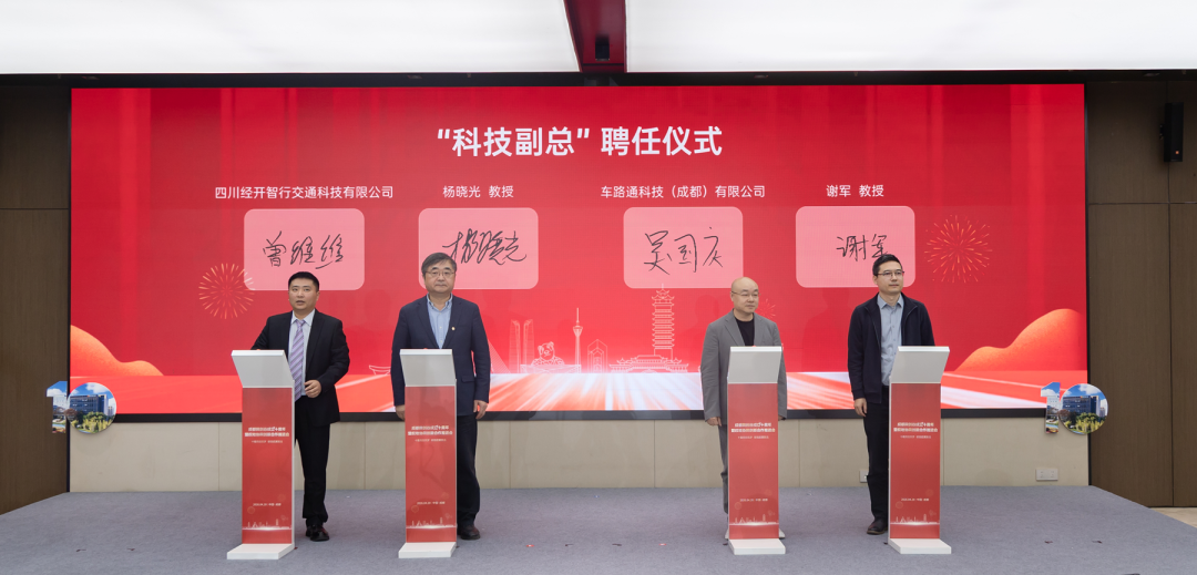 对许多中小科技企业而言,离技术突破就差临门一脚:实验室里的专家出不来,对口的专业人才招不到。“科技副总”聘任将打破这一局面。活动现场,同济大学智能交通运输系统研究中心主任杨晓光教授、西南交通大学谢军教授两名顶尖专家,分别受聘为成都智能网联汽车发展有限公司、车路通科技(成都)有限公司的“科技副总”。未来,这些“科技副总”将为企业发展提供精准的技术指导与资源支持,助力企业向新发展。